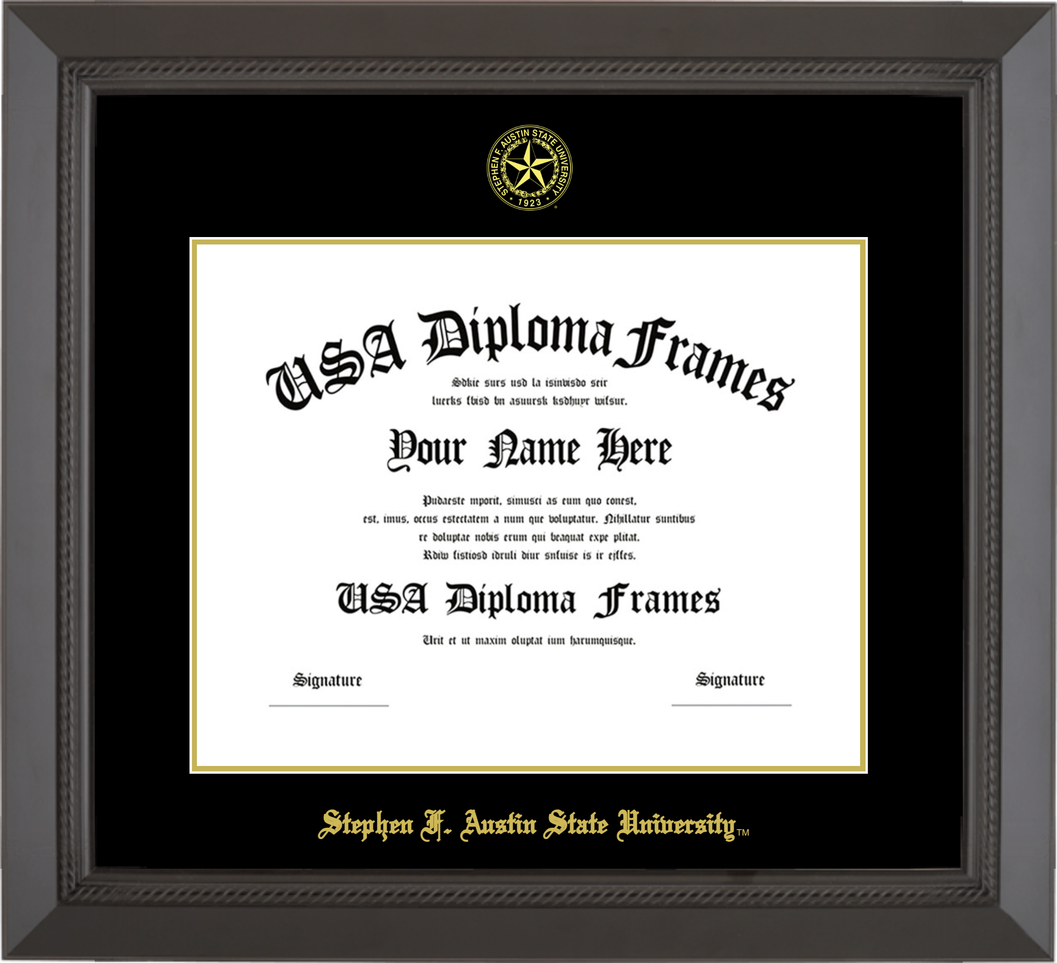 Stephen F. Austin State University Diploma Frame – Black Rope – Black and Gold Mat – Gold Seal