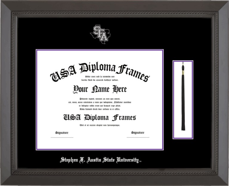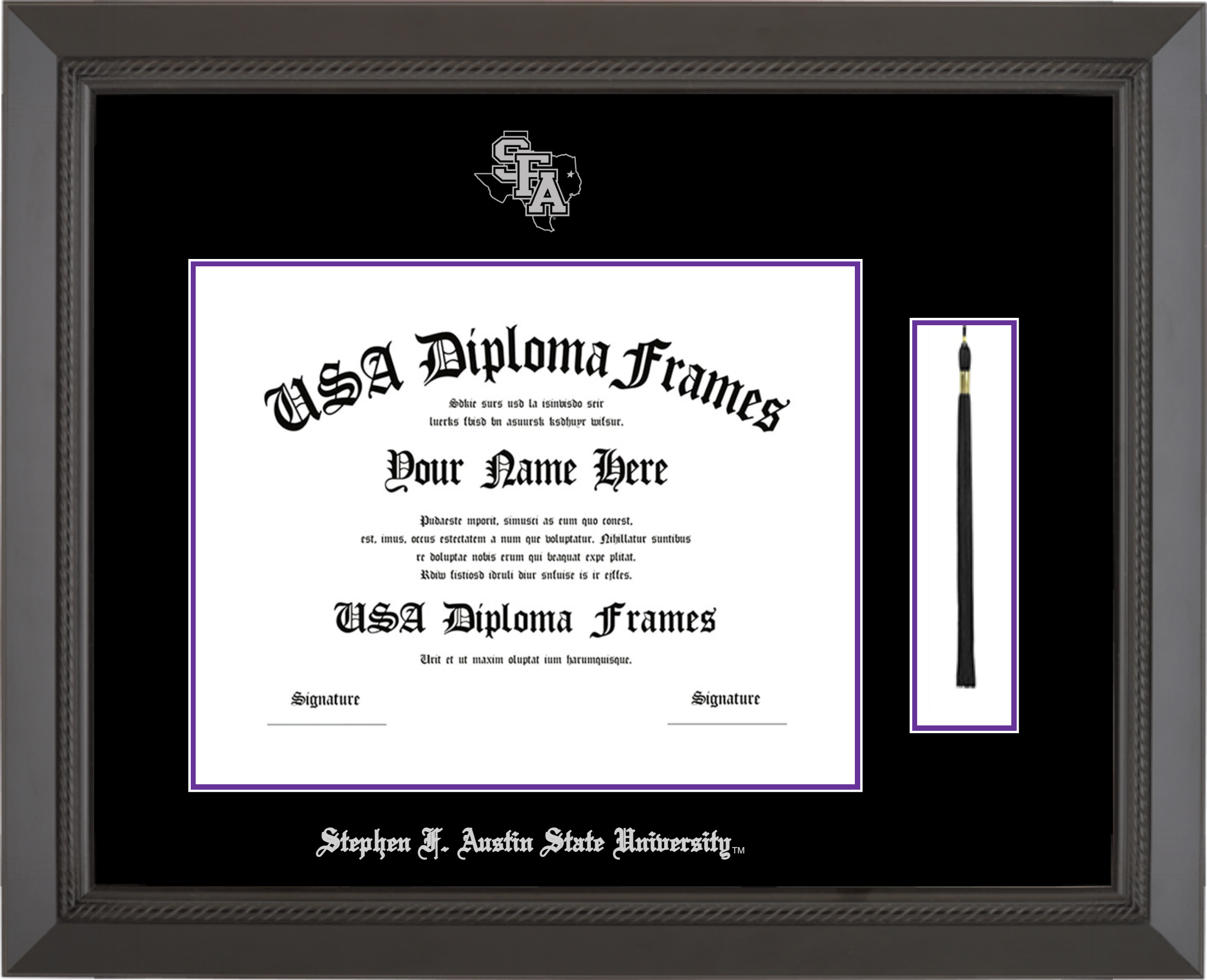 Stephen F. Austin State University Diploma Frame with Tassel – SFA – Black Rope – Black and Purple Mat – Silver Athletic Seal