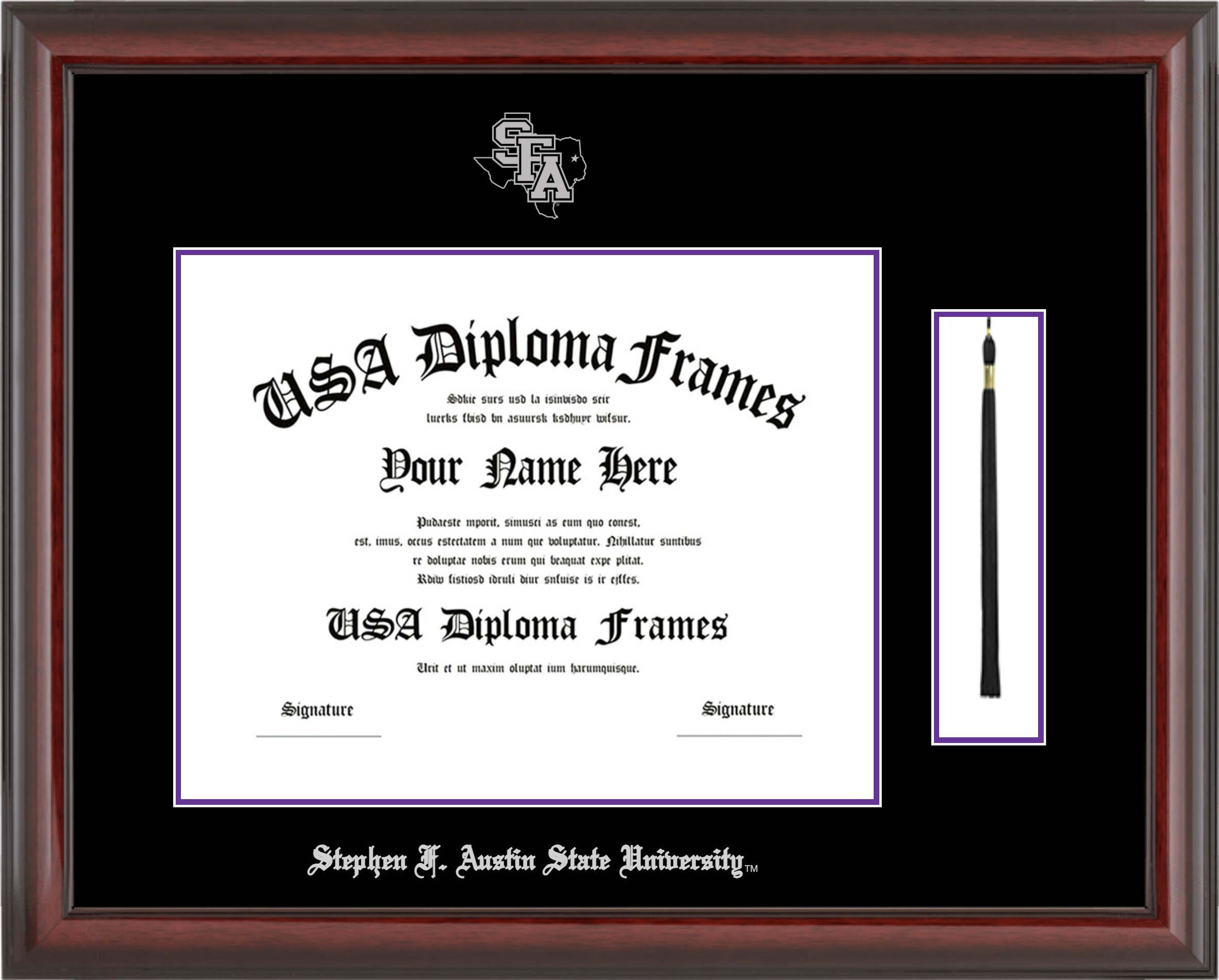 Stephen F. Austin State University Diploma Frame with Tassel – Cherry Mahogany Glossy – Black and Purple Mat – Silver Athletic Seal