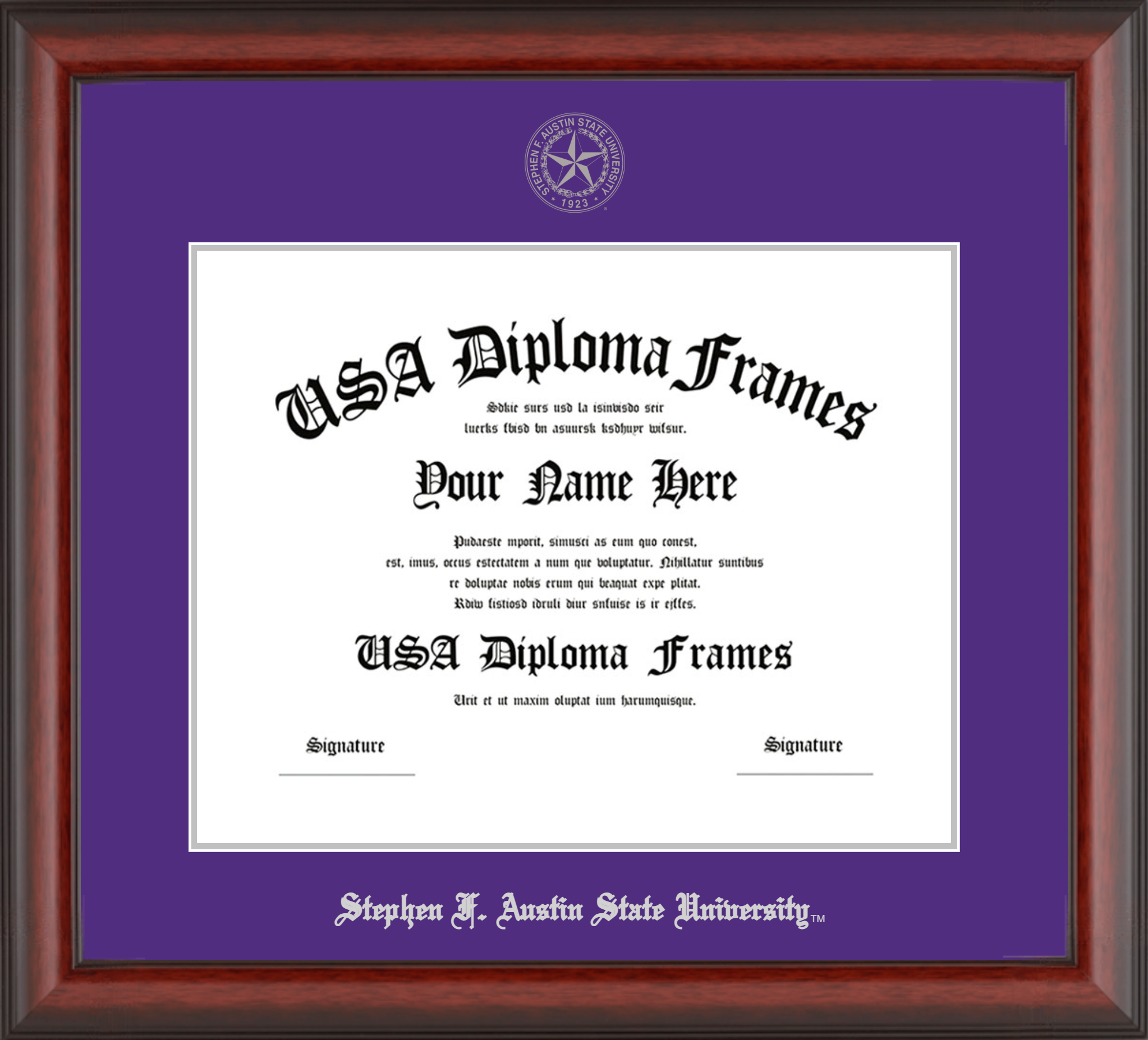 Stephen F. Austin State University – Single Horizontal Document ( Diploma ) – Cherry Mahogany Matte – Purple Mat – Silver Accent Mat – With Seal(University Seal Silver) – With Silver Embossing (Stephen F. Austin State University)