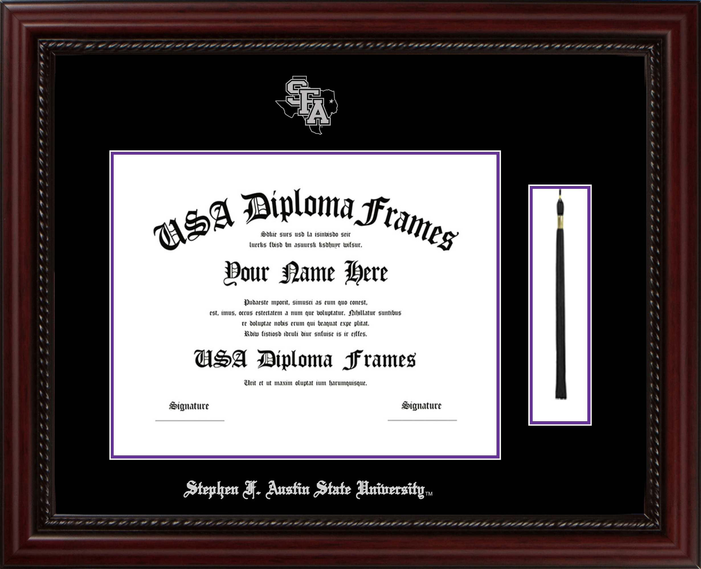 Stephen F. Austin State University Diploma Frame with Tassel – SFA – Executive Cherry Rope – Black and Purple Mat – Silver Athletic Seal
