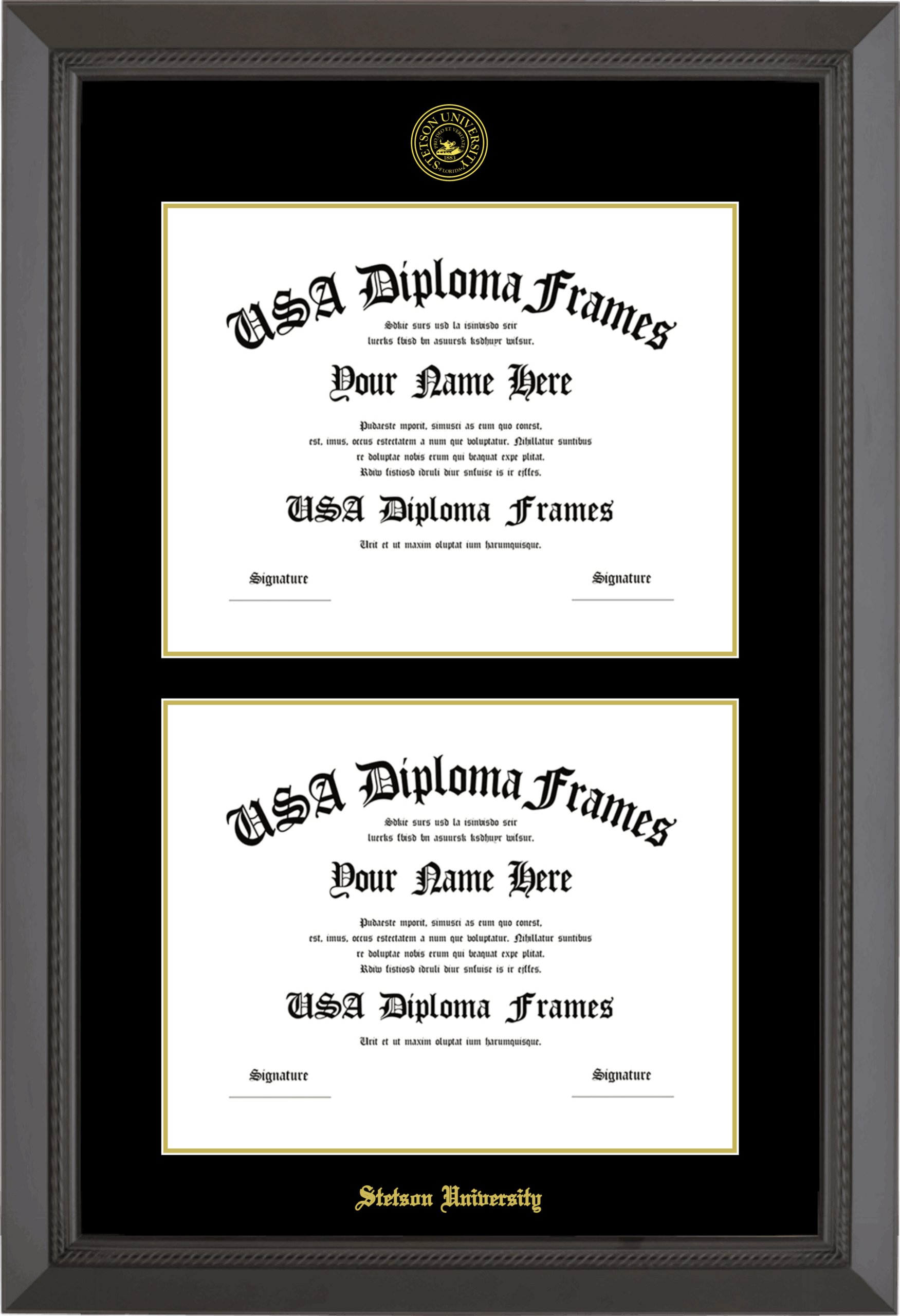 Stetson University Double Diploma Frame – Double Document – Black Rope – Black and Gold Mat