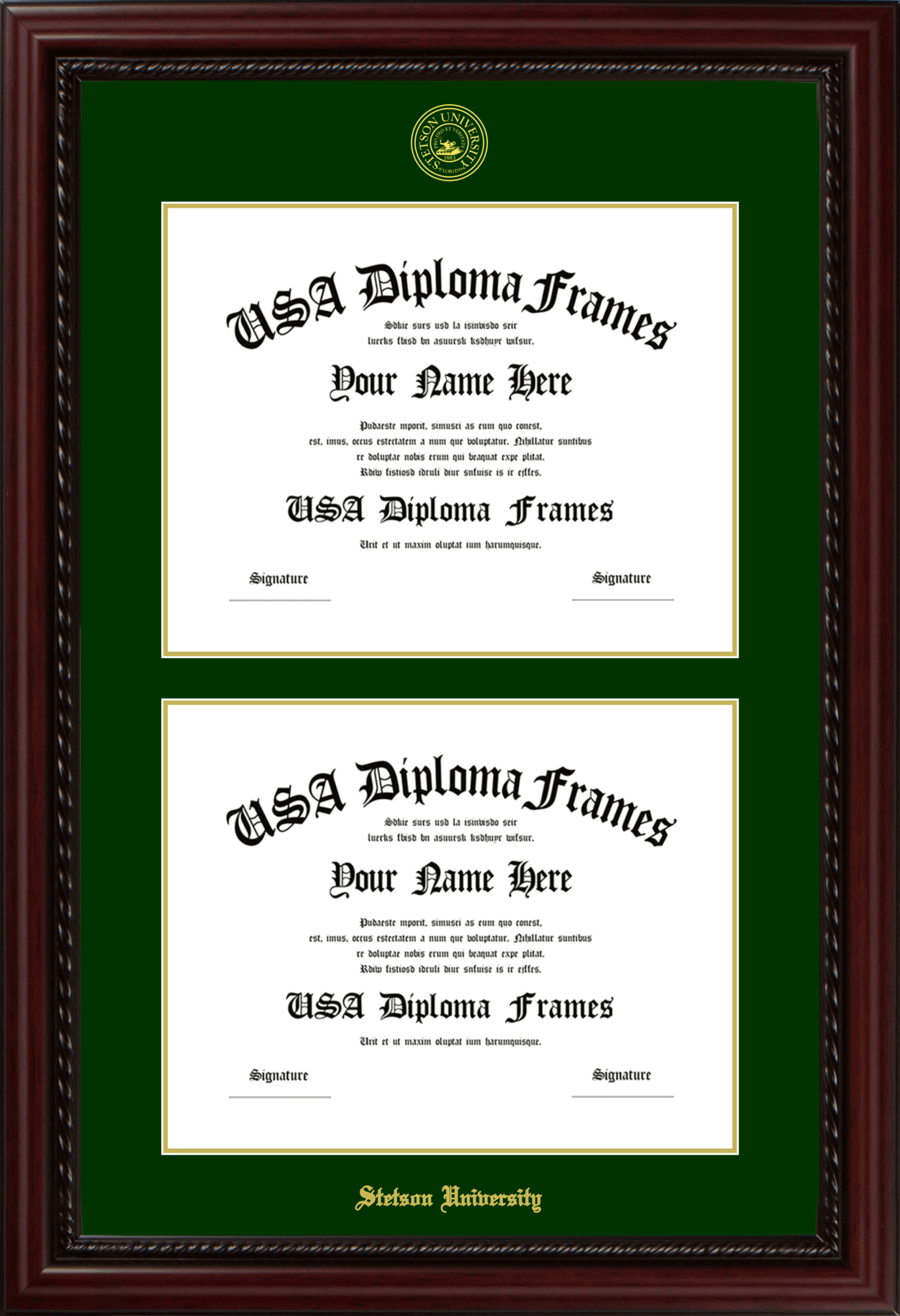 Stetson University Double Diploma Frame – Double Document – Executive Cherry Rope – Winter Green and Gold Mat