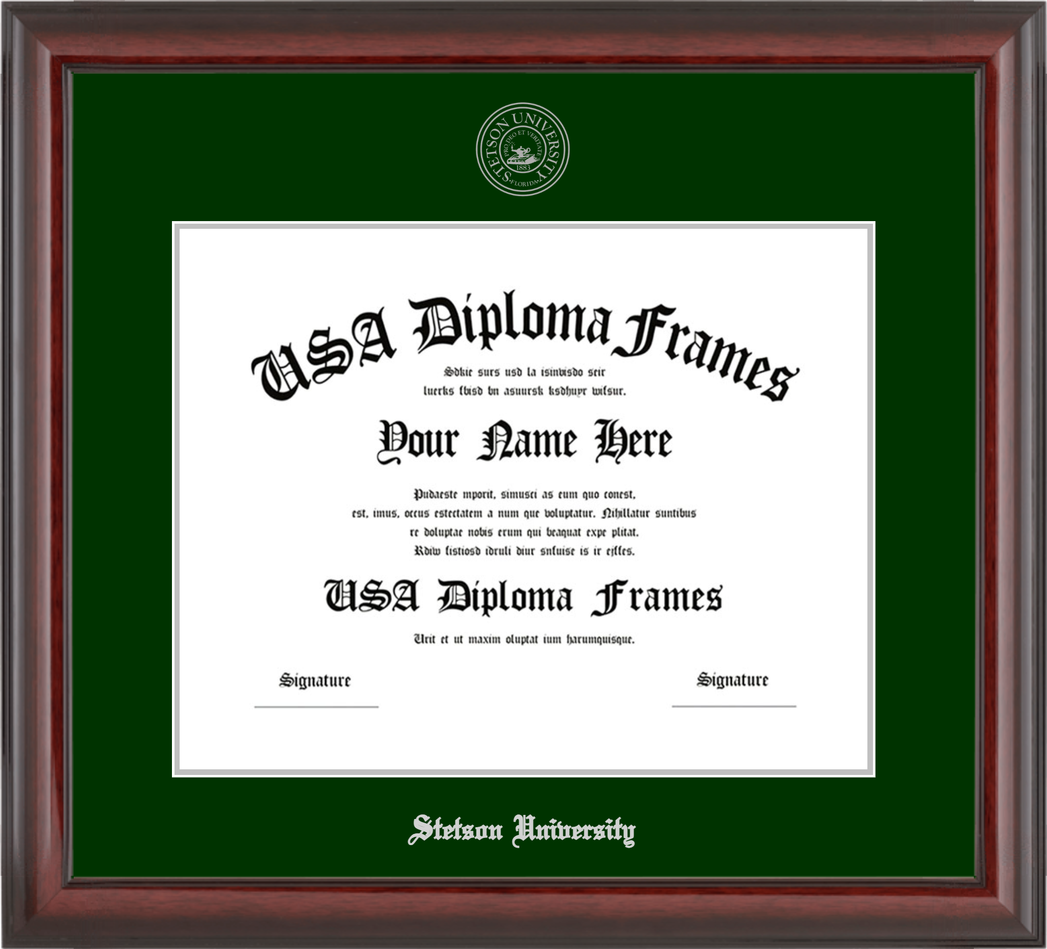 Stetson University – Single Horizontal Document ( Diploma ) – Cherry Mahogany Glossy – Winter Green Mat – Silver Accent Mat – With Seal(University Seal Seal) – With Silver Embossing (Stetson University)