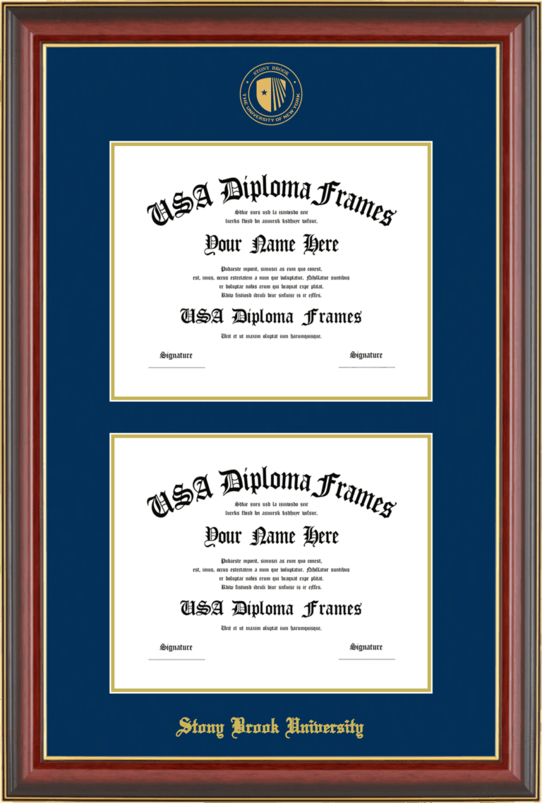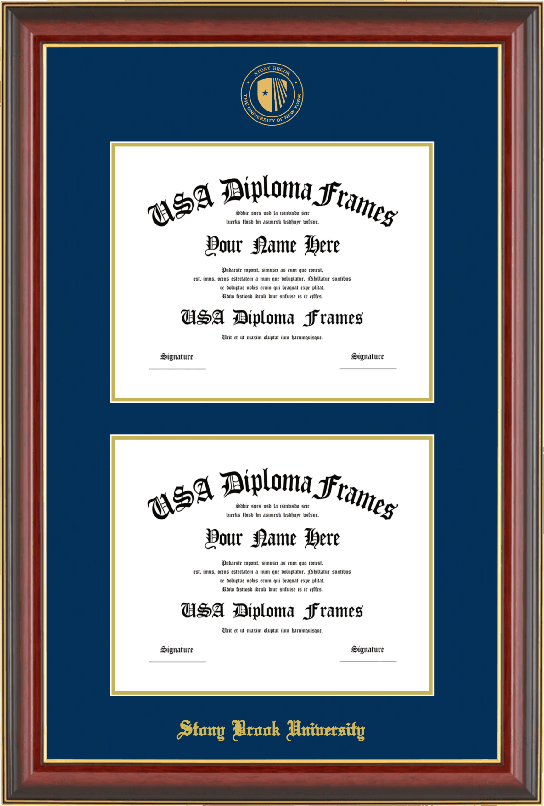 Stony Brook University SUNY Double Diploma Frame – Double Document – Cherry Mahogany Gold Trim Glossy – Navy and Gold Mat