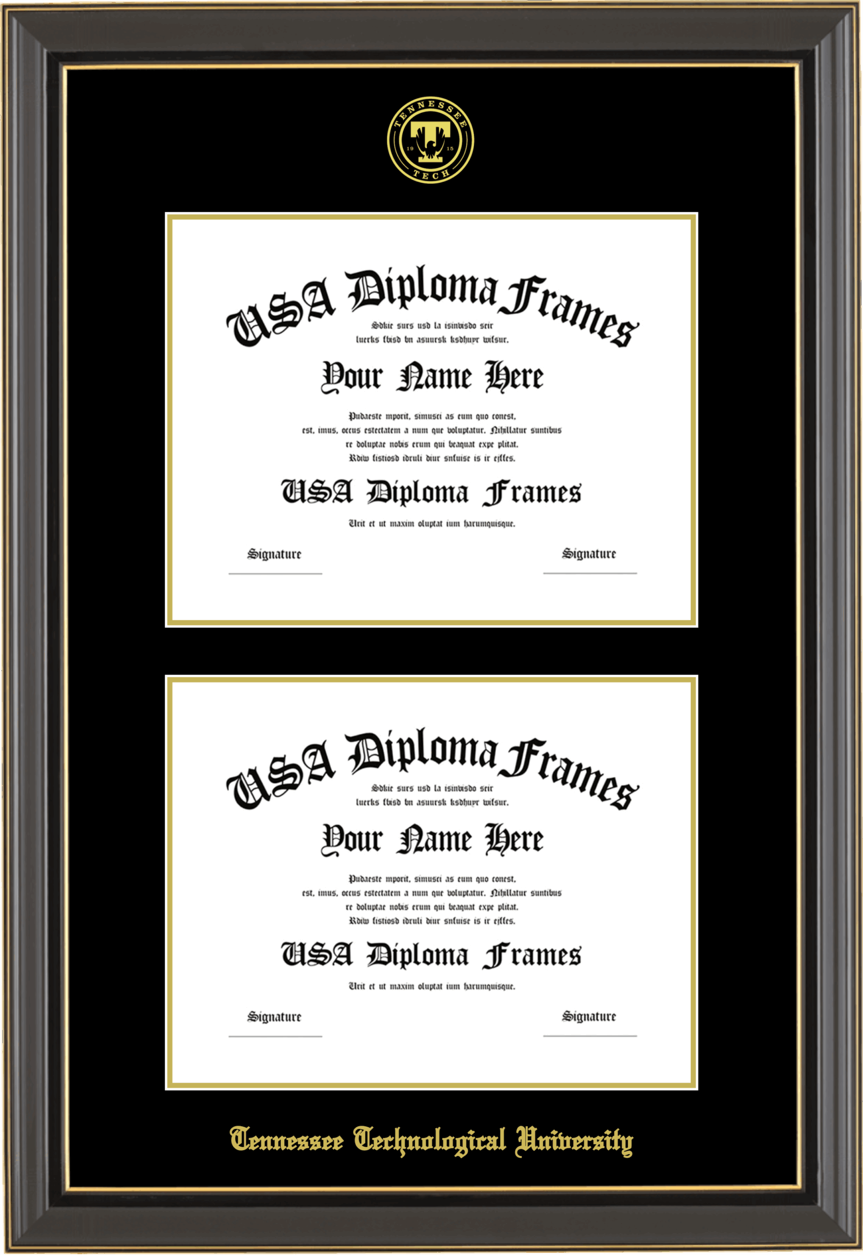 Tennessee Technological University Double Diploma Frame – Double Document – Black Gold Trim Glossy – Black and Gold Mat