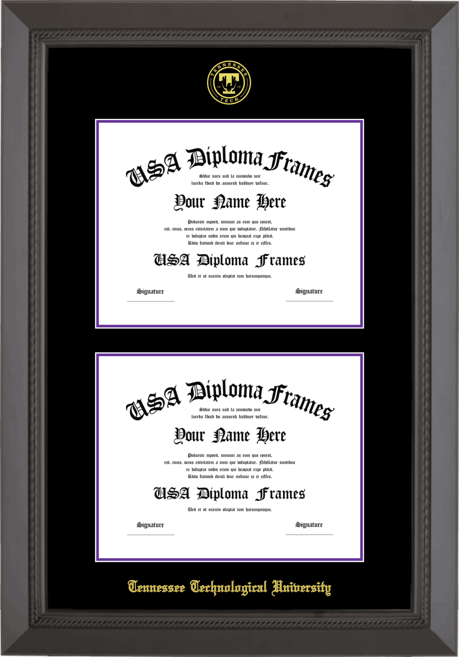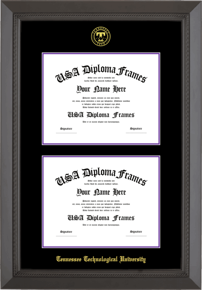 Tennessee Technological University Double Diploma Frame – Double Document – Black Rope – Black and Purple Mat