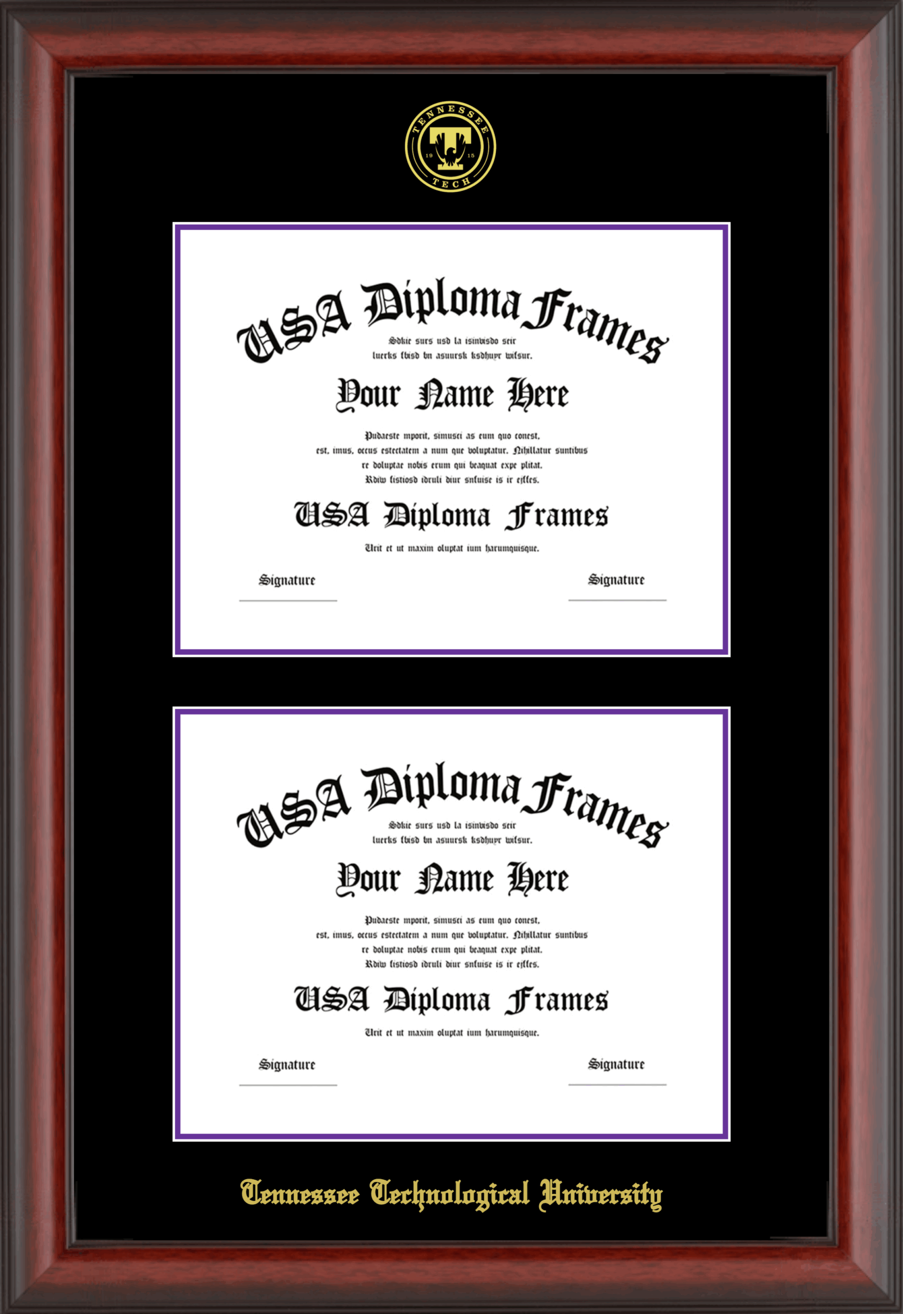 Tennessee Technological University Double Diploma Frame – Double Document – Cherry Mahogany Matte – Black and Purple Mat