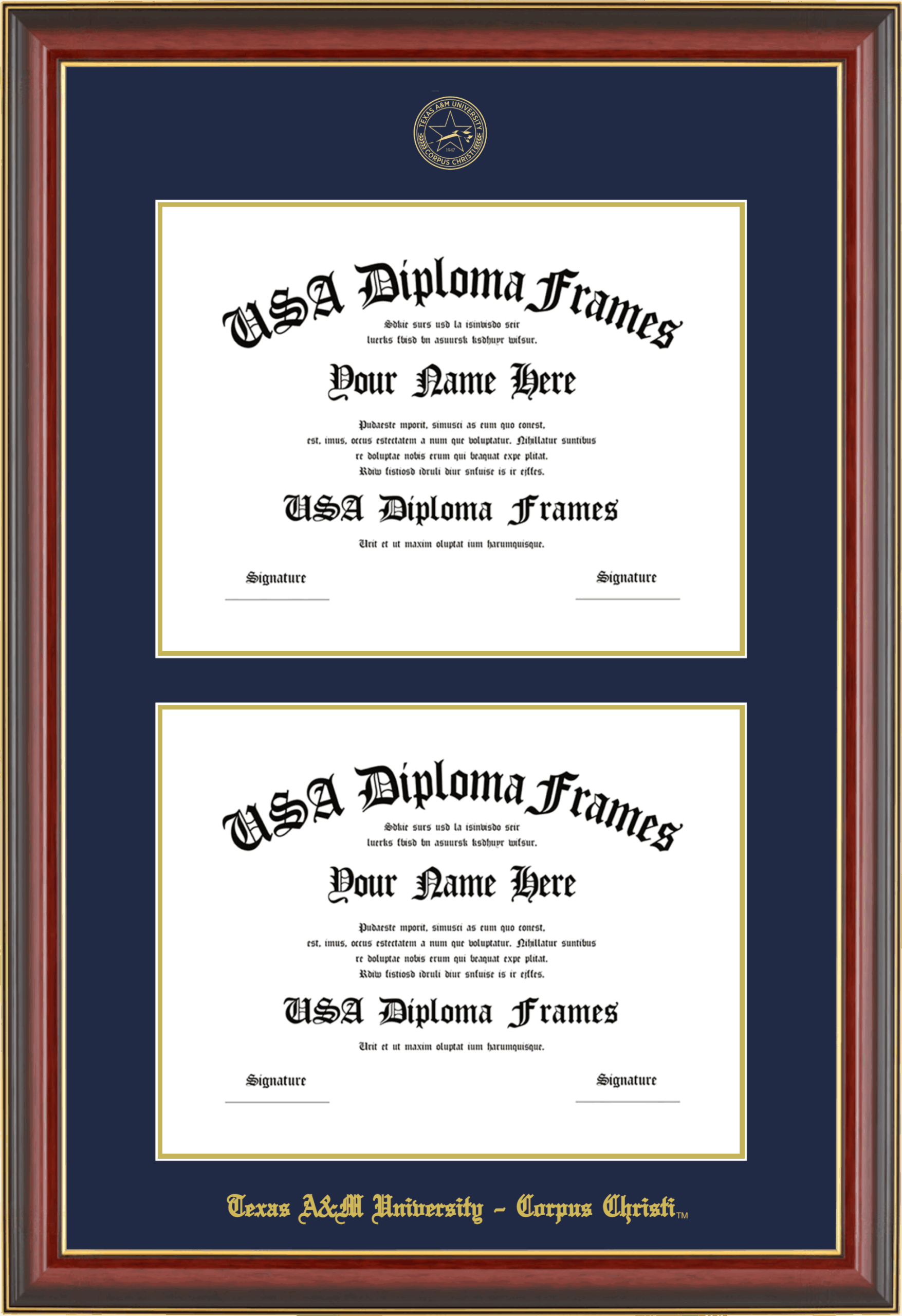 Texas A&M University – Corpus Christi Double Diploma Frame – Double Document – Cherry Mahogany Gold Trim Glossy – Navy and Gold Mat