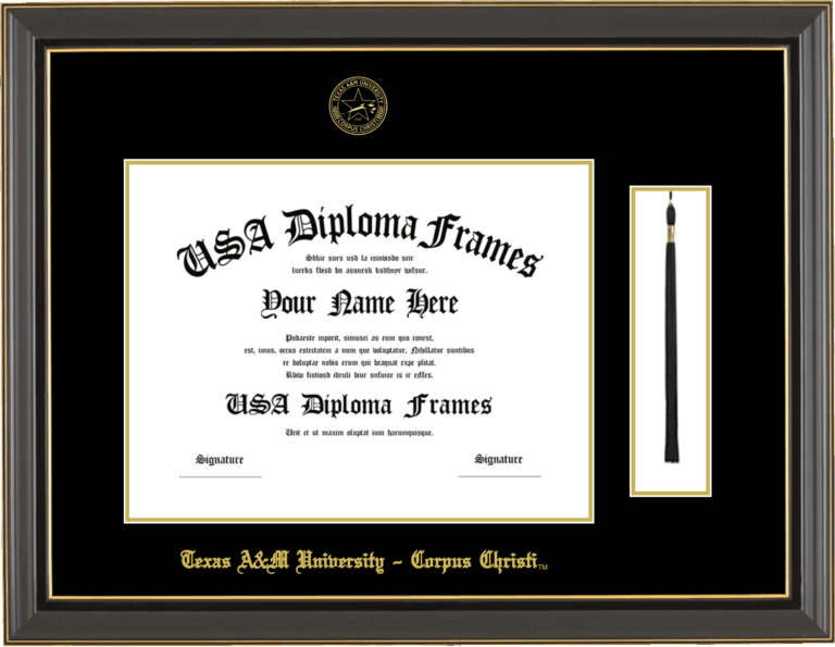 Texas A&M University – Corpus Christi Diploma Frame with Tassel – Black Gold Trim Glossy – Black and Gold Mat