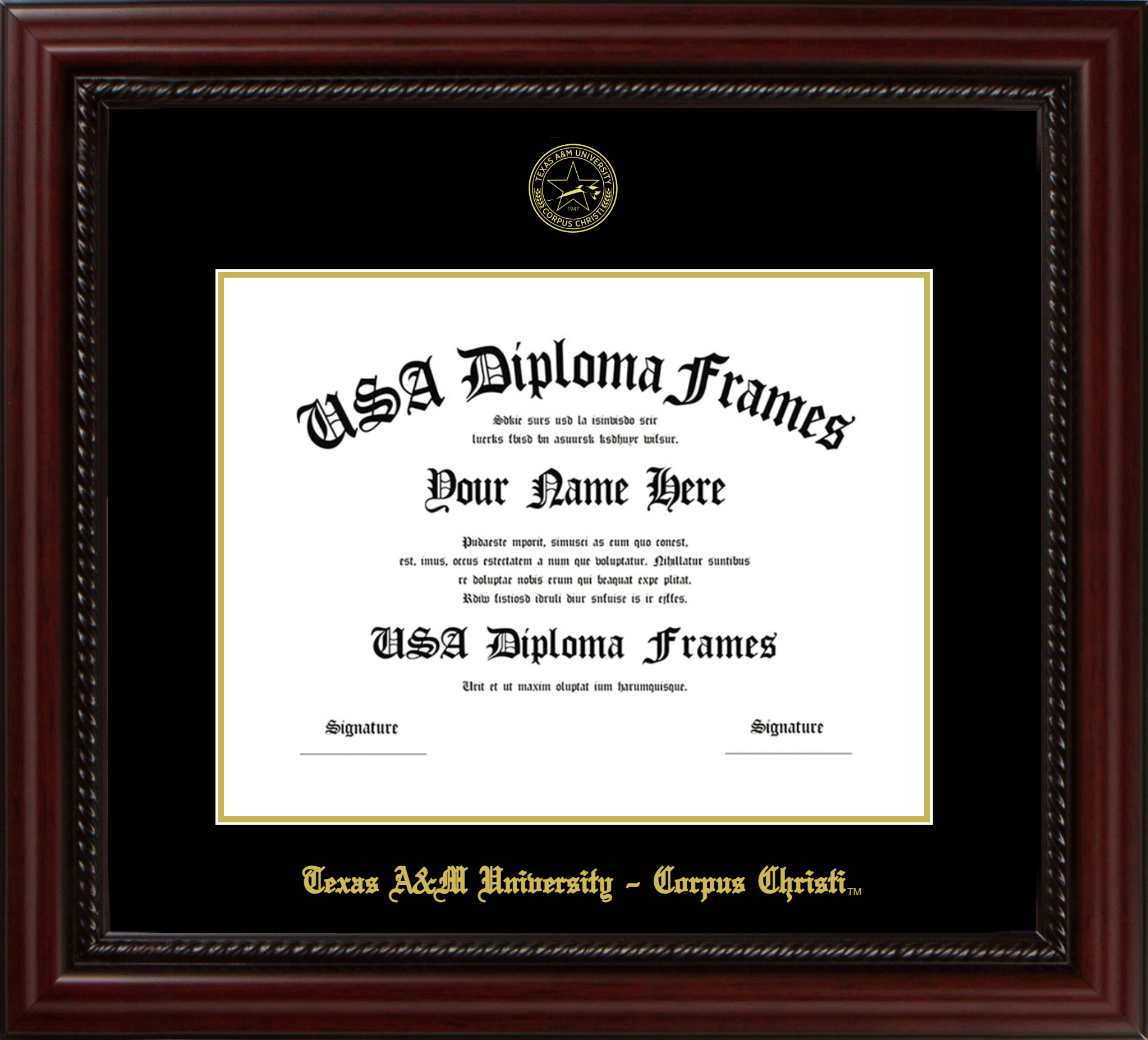 Texas A&M University – Corpus Christi Diploma Frame – Executive Cherry Rope – Black and Gold Mat