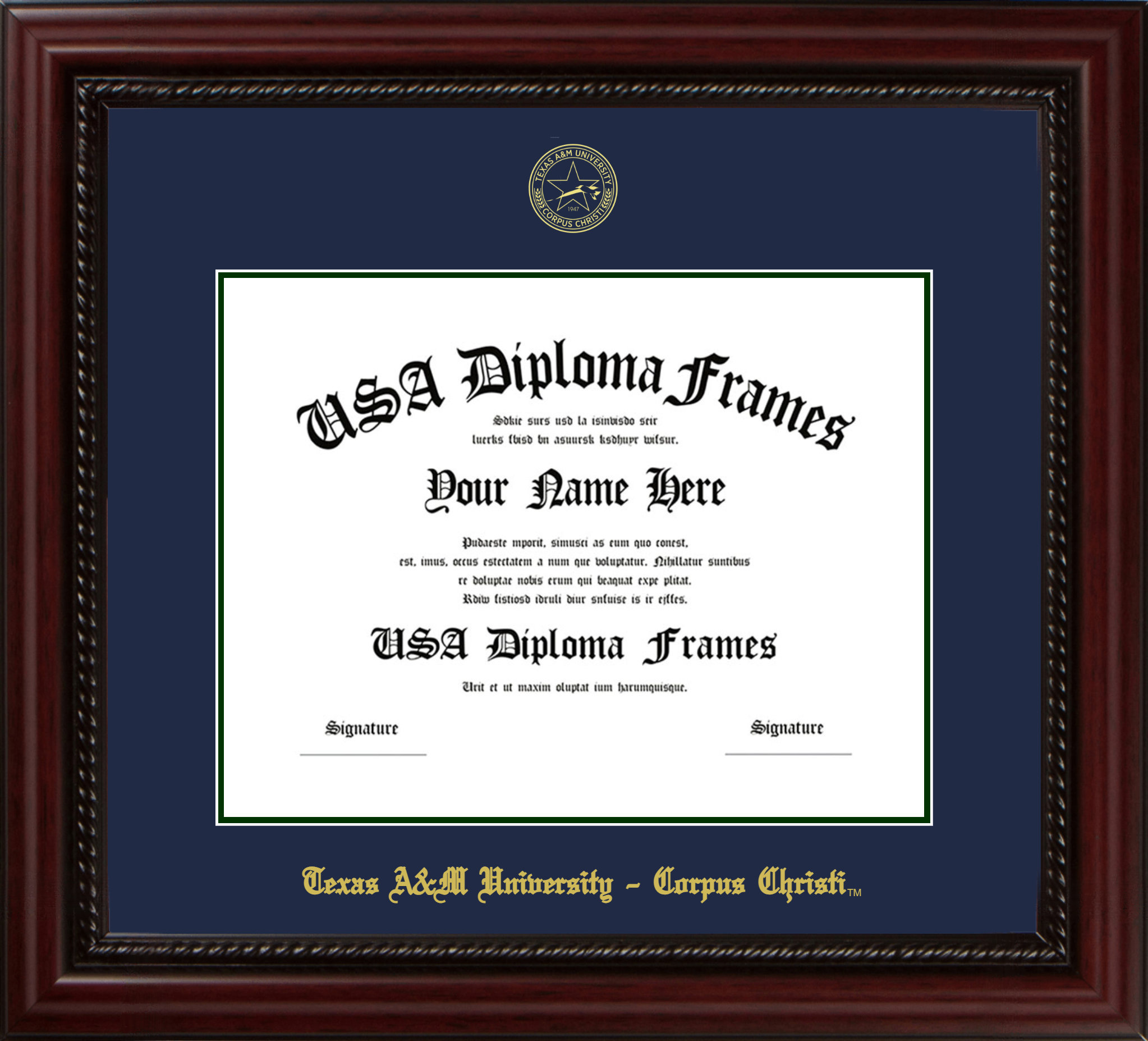 Texas A&M University – Corpus Christi Diploma Frame – Executive Cherry Rope – Navy and Winter Green Mat