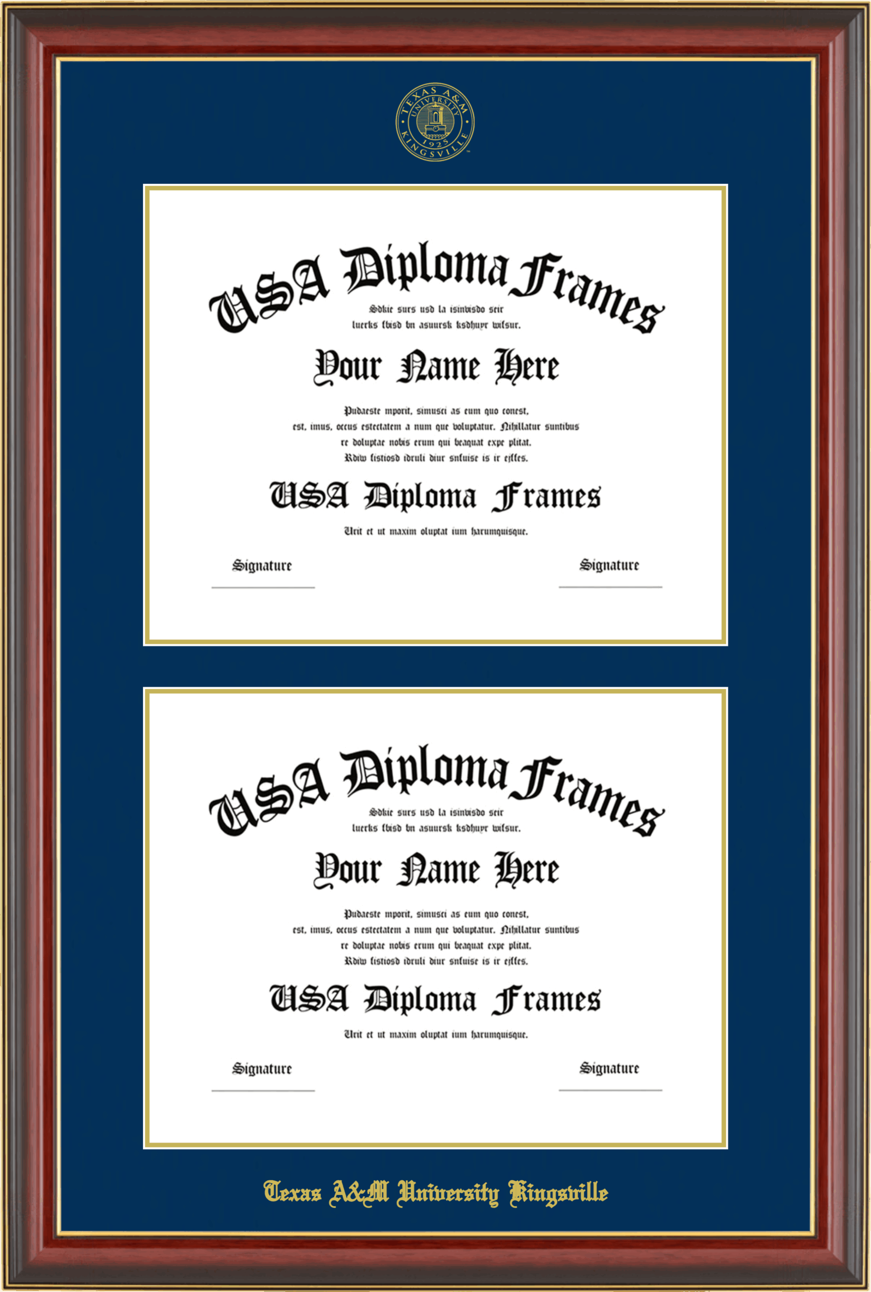 Texas A&M University – Kingsville Double Diploma Frame – Double Document – Cherry Mahogany Gold Trim Glossy – Navy and Gold Mat
