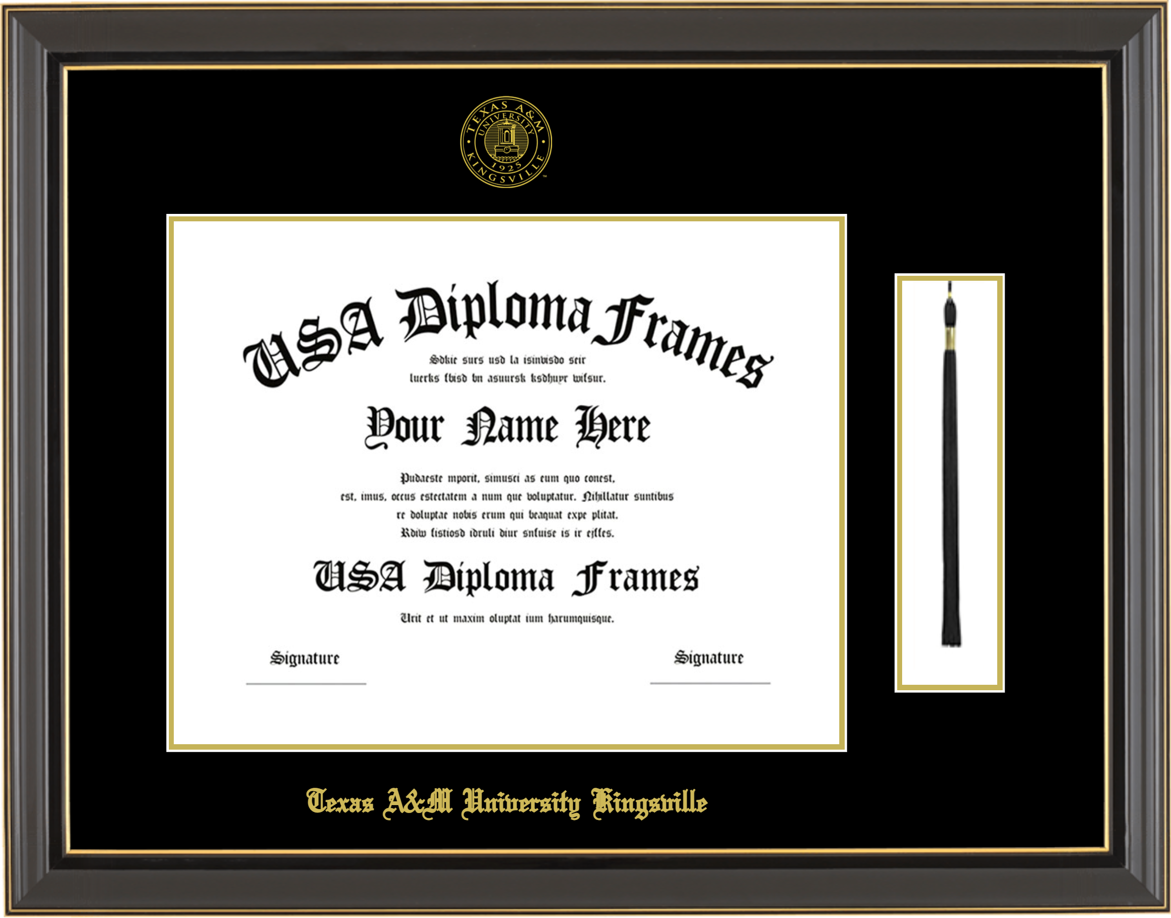 Texas A&M University – Kingsville Diploma Frame with Tassel – Black Gold Trim Glossy – Black and Gold Mat