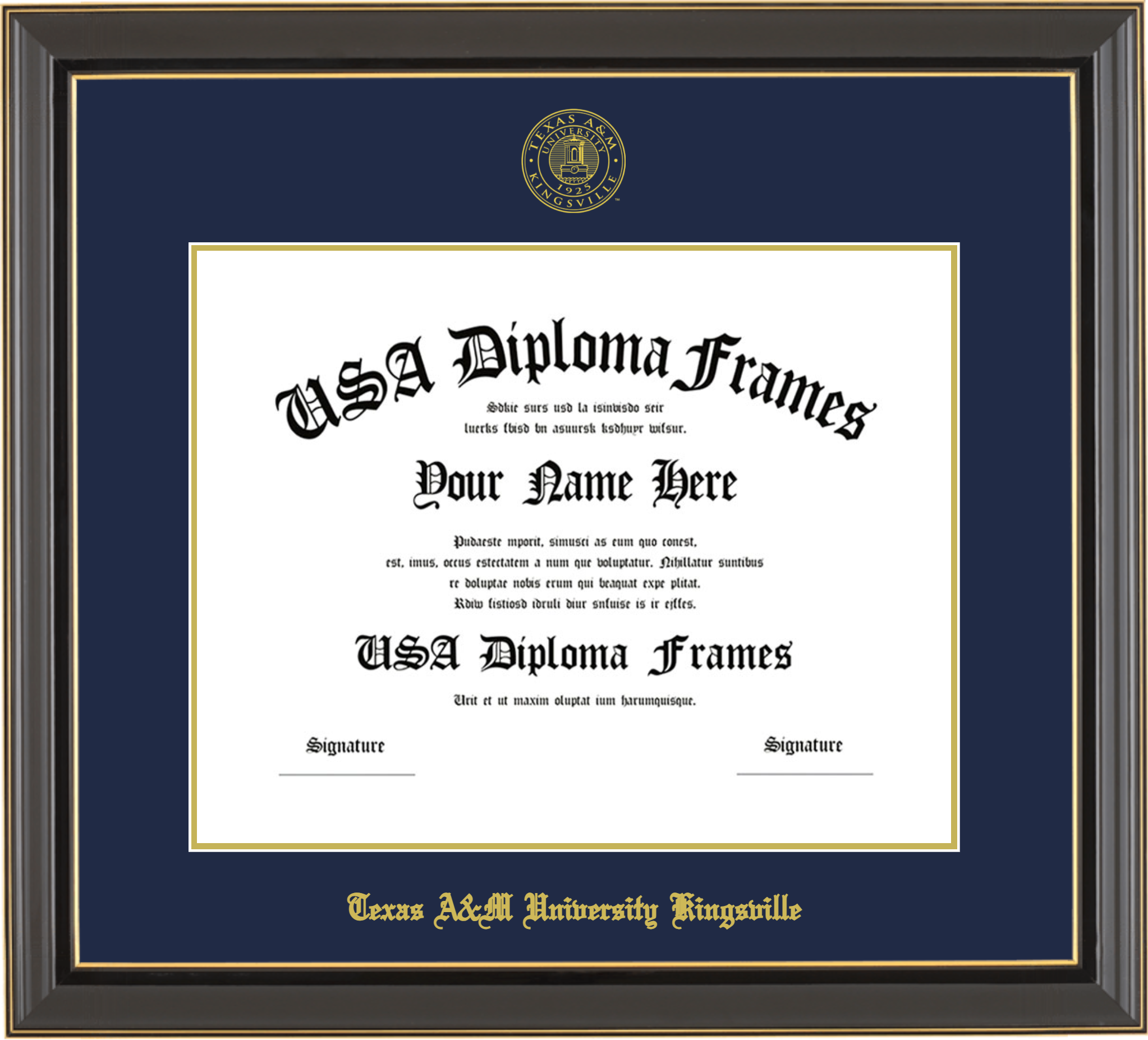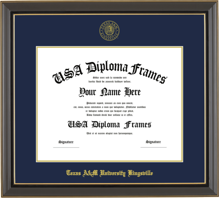 Texas A&M University – Kingsville – Single Horizontal Document ( Diploma ) – Black Gold Trim Glossy – Navy Mat – Gold Accent Mat – With Seal(University Seal Gold) – With Gold Embossing (Texas A&M University Kingsville)