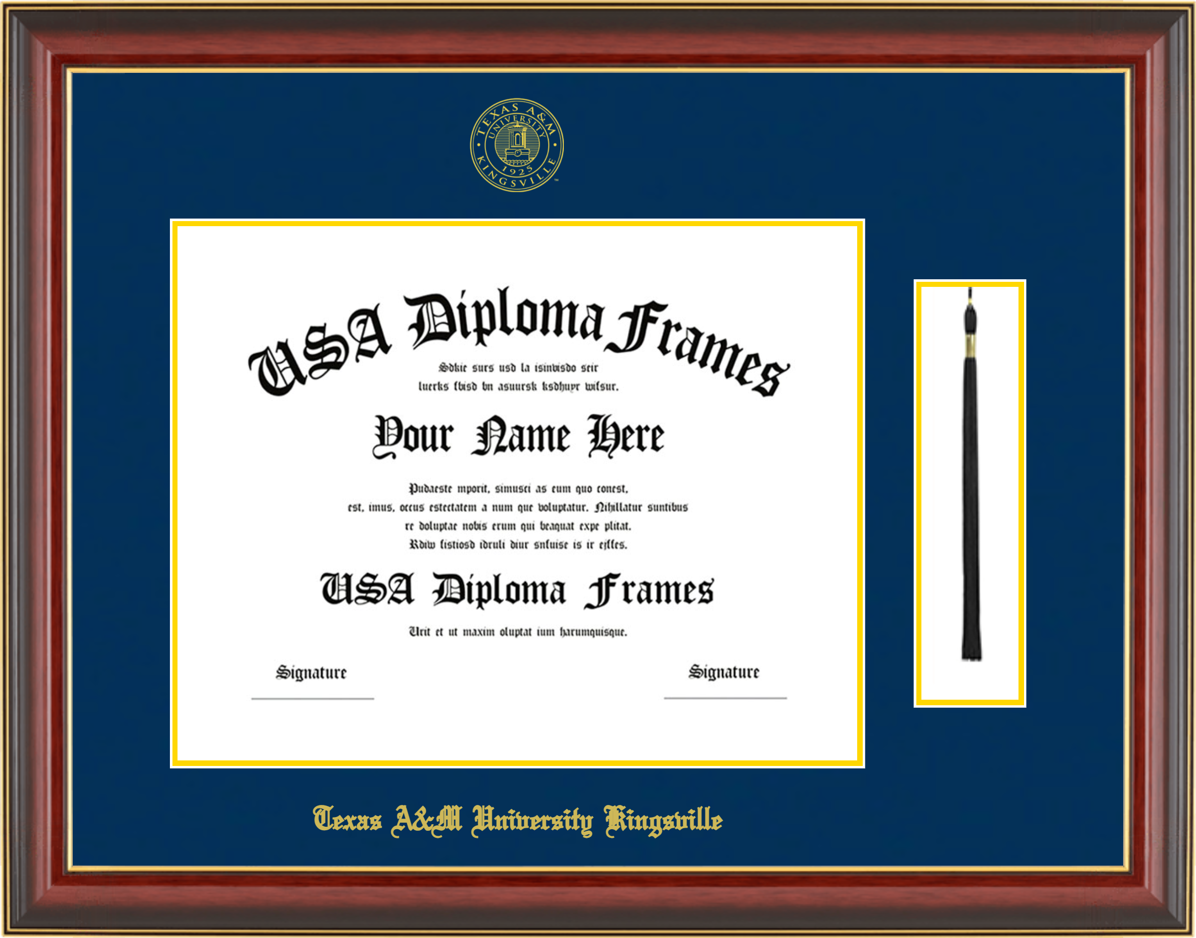 Texas A&M University – Kingsville Diploma Frame with Tassel – Cherry Mahogany Gold Trim Glossy – Navy and Yellow Gold Mat