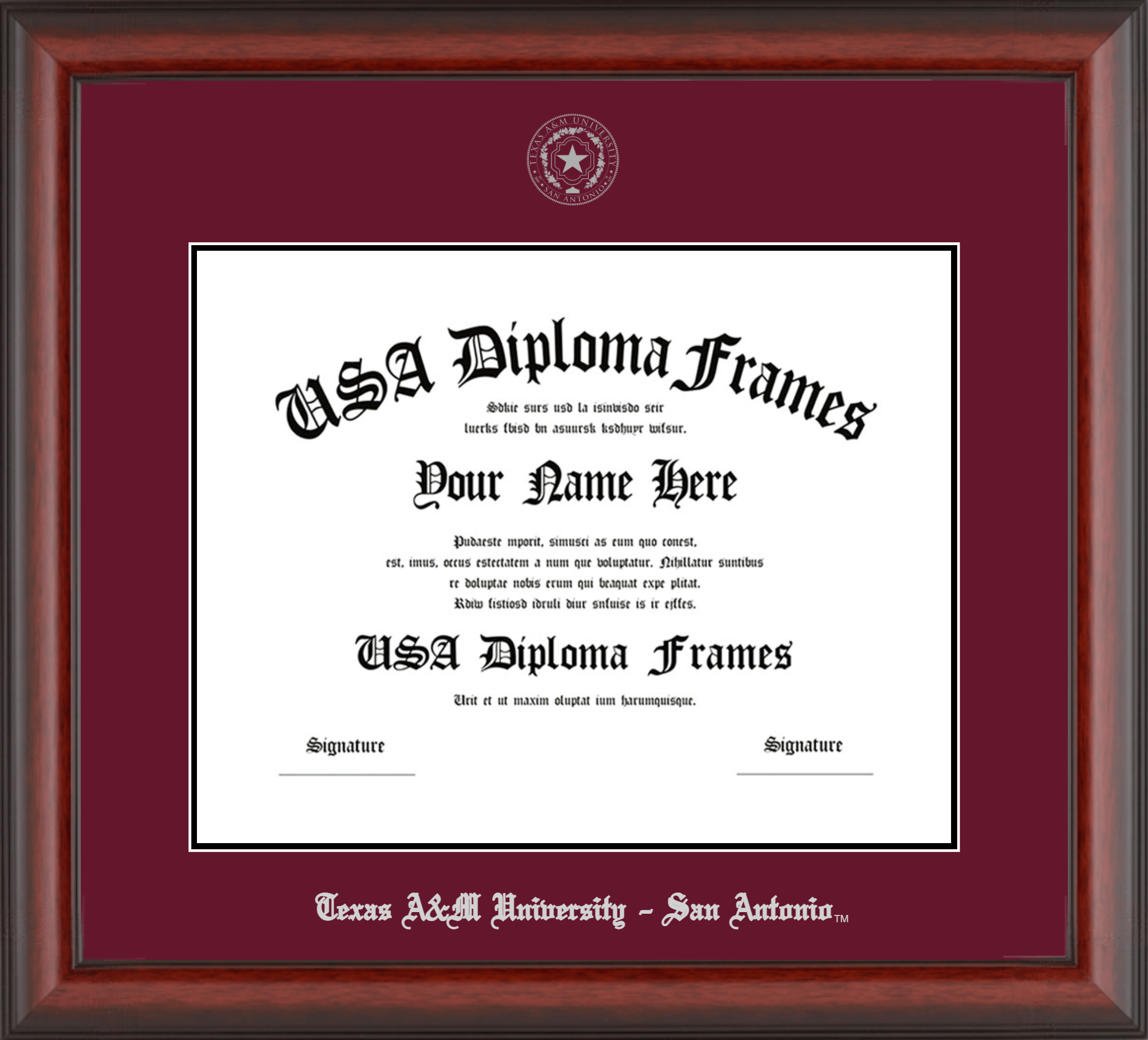 Texas A&M University – San Antonio – Single Horizontal Document ( Diploma ) – Cherry Mahogany Matte – Maroon Mat – Black Accent Mat – With Seal(University Seal Silver) – With Silver Embossing (Texas A&M University – San Antonio)
