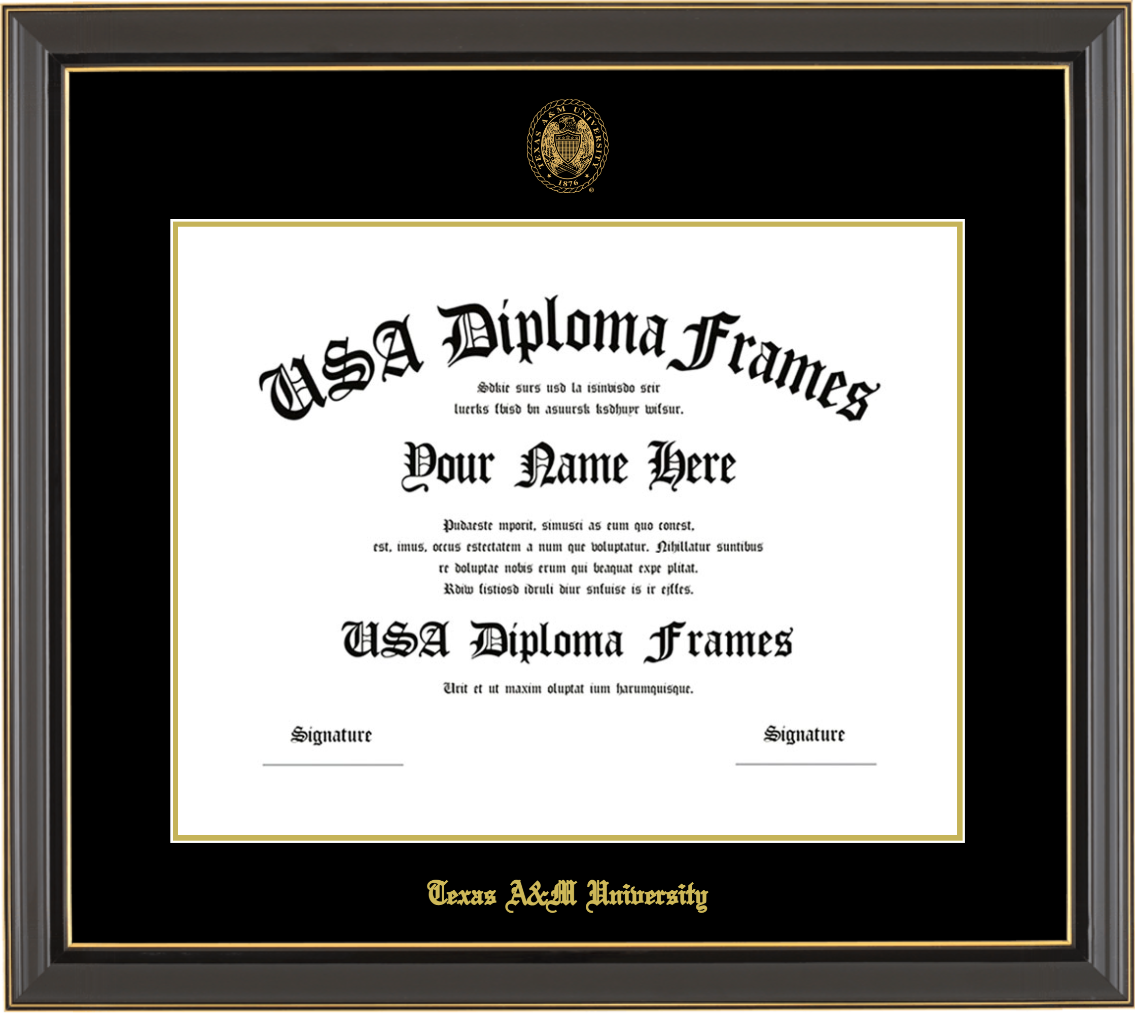 Texas A&M University Diploma Frame – Black Gold Trim Glossy – Black and Gold Mat