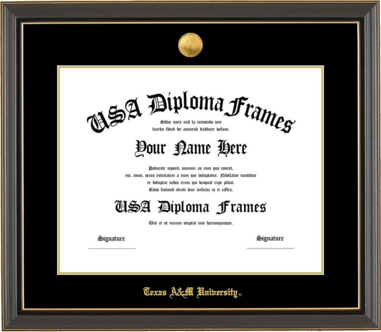 Texas A&M University – Single Horizontal Document ( 12.5 x 16 ) – Black Gold Trim Glossy – Black Mat – Gold Accent Mat – With Seal(University Seal Medallion) – With Gold Embossing (Texas A&M University)