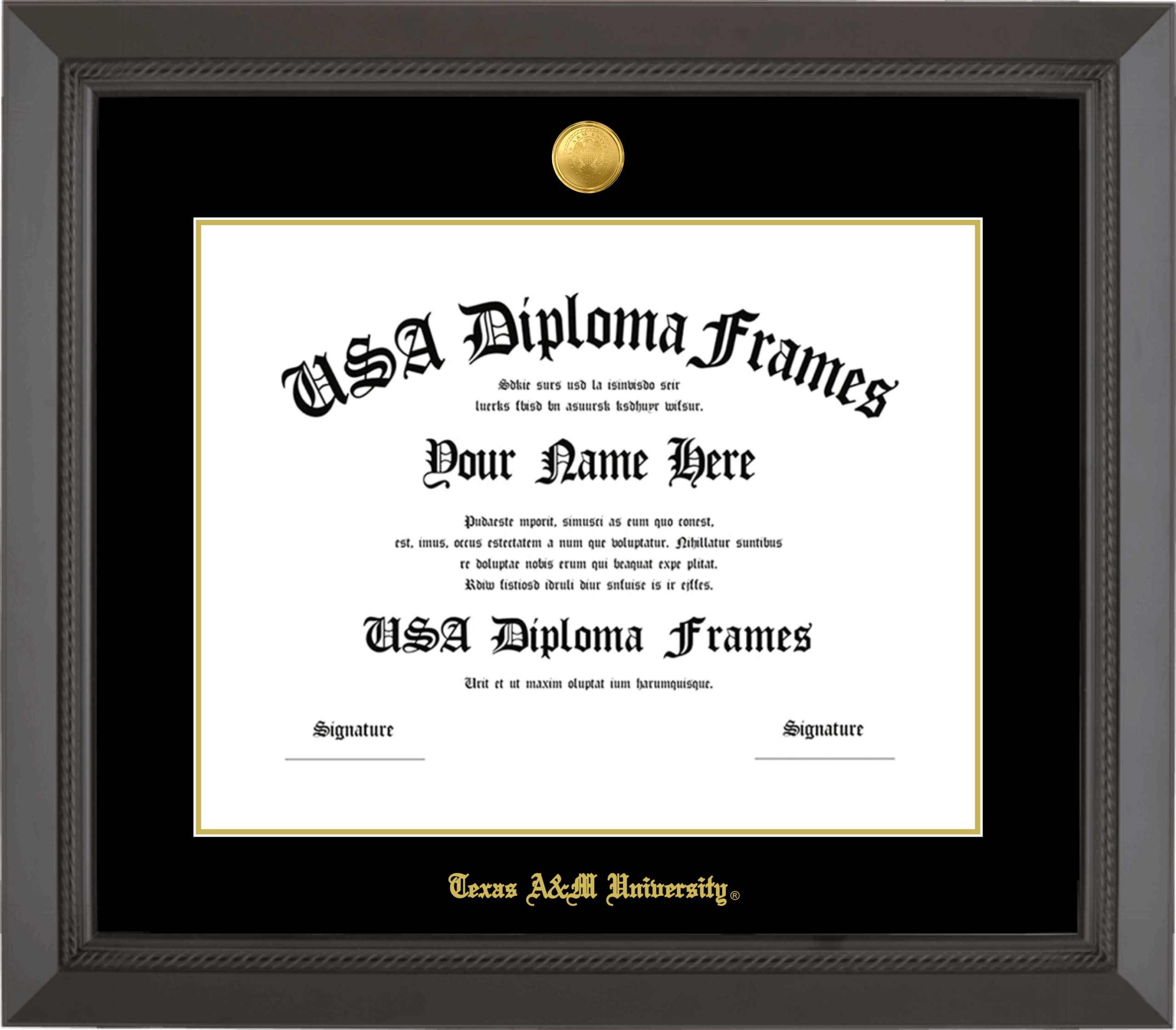 Texas A&M University – Single Horizontal Document ( 12.5 x 16 ) – Black Rope – Black Mat – Gold Accent Mat – With Seal(University Seal Medallion) – With Gold Embossing (Texas A&M University)