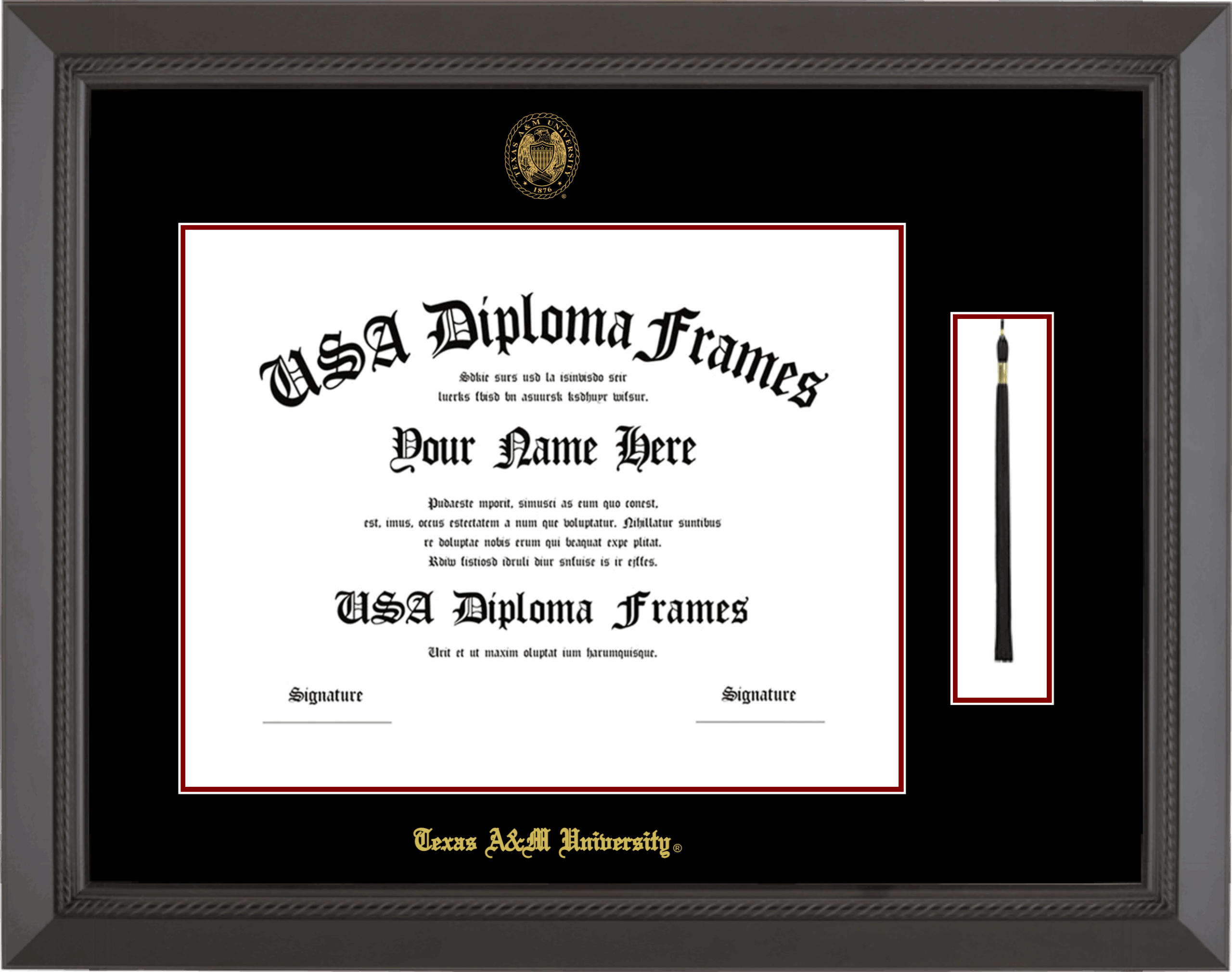 Texas A&M University – Single Horizontal Document ( 12.5 x 16 ) – Black Rope – Black Mat – Maroon Accent Mat – With Tassel(Default) – With Seal(University Seal Gold) – With Gold Embossing (Texas A&M University)