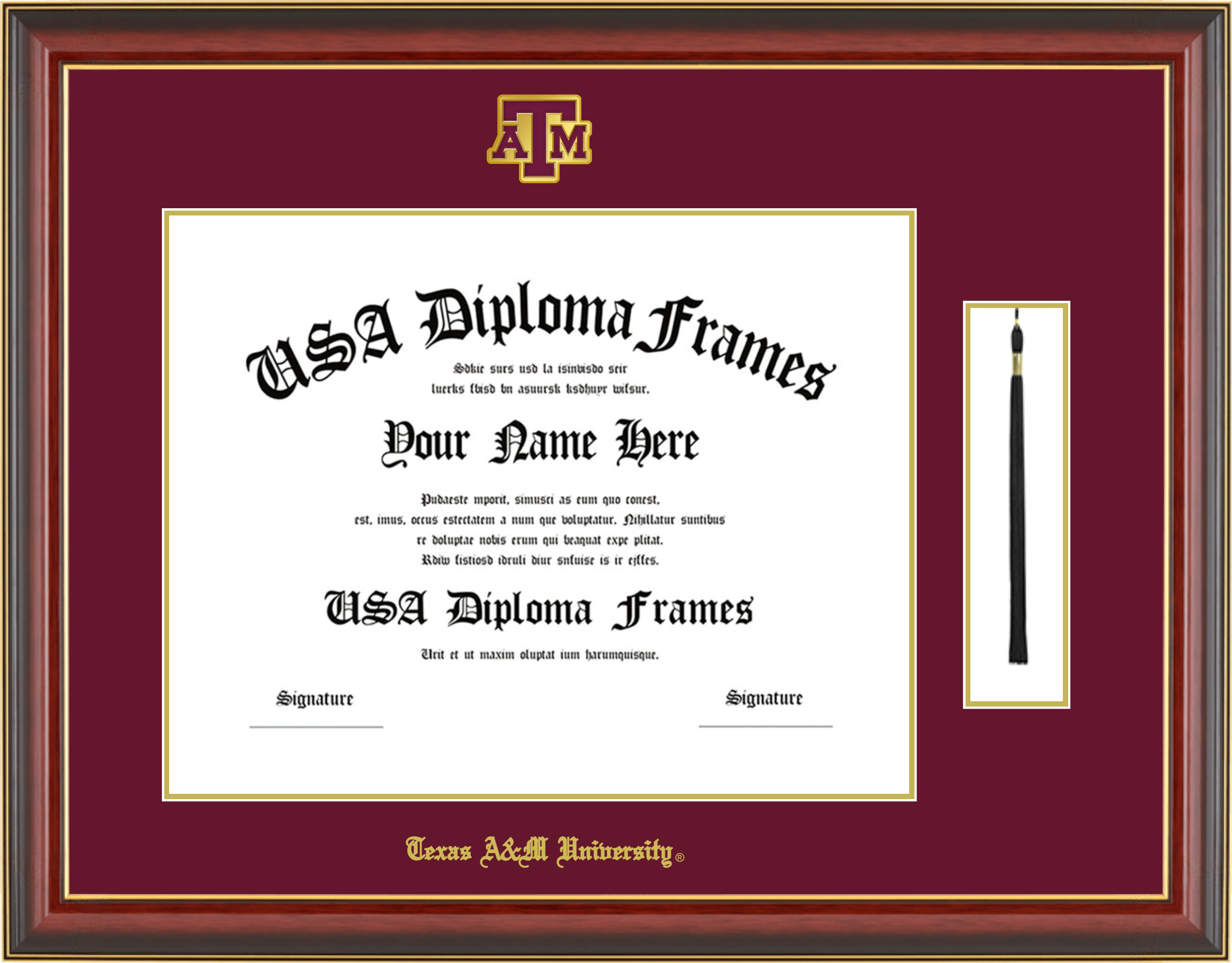 Texas A&M University – Single Horizontal Document ( 12.5 x 16 ) – Cherry Mahogany Gold Trim Glossy – Maroon Mat – Gold Accent Mat – With Tassel(Default) – With Seal(University Logo Medallion) – With Gold Embossing (Texas A&M University)
