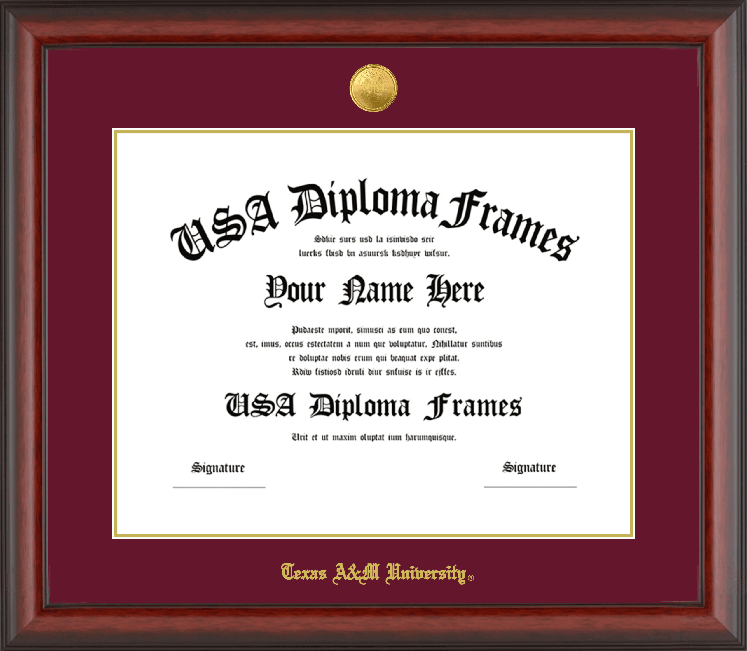 Texas A&M University – Single Horizontal Document ( 12.5 x 16 ) – Cherry Mahogany Matte – Maroon Mat – Gold Accent Mat – With Seal(University Seal Medallion) – With Gold Embossing (Texas A&M University)