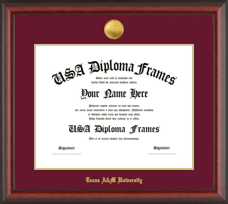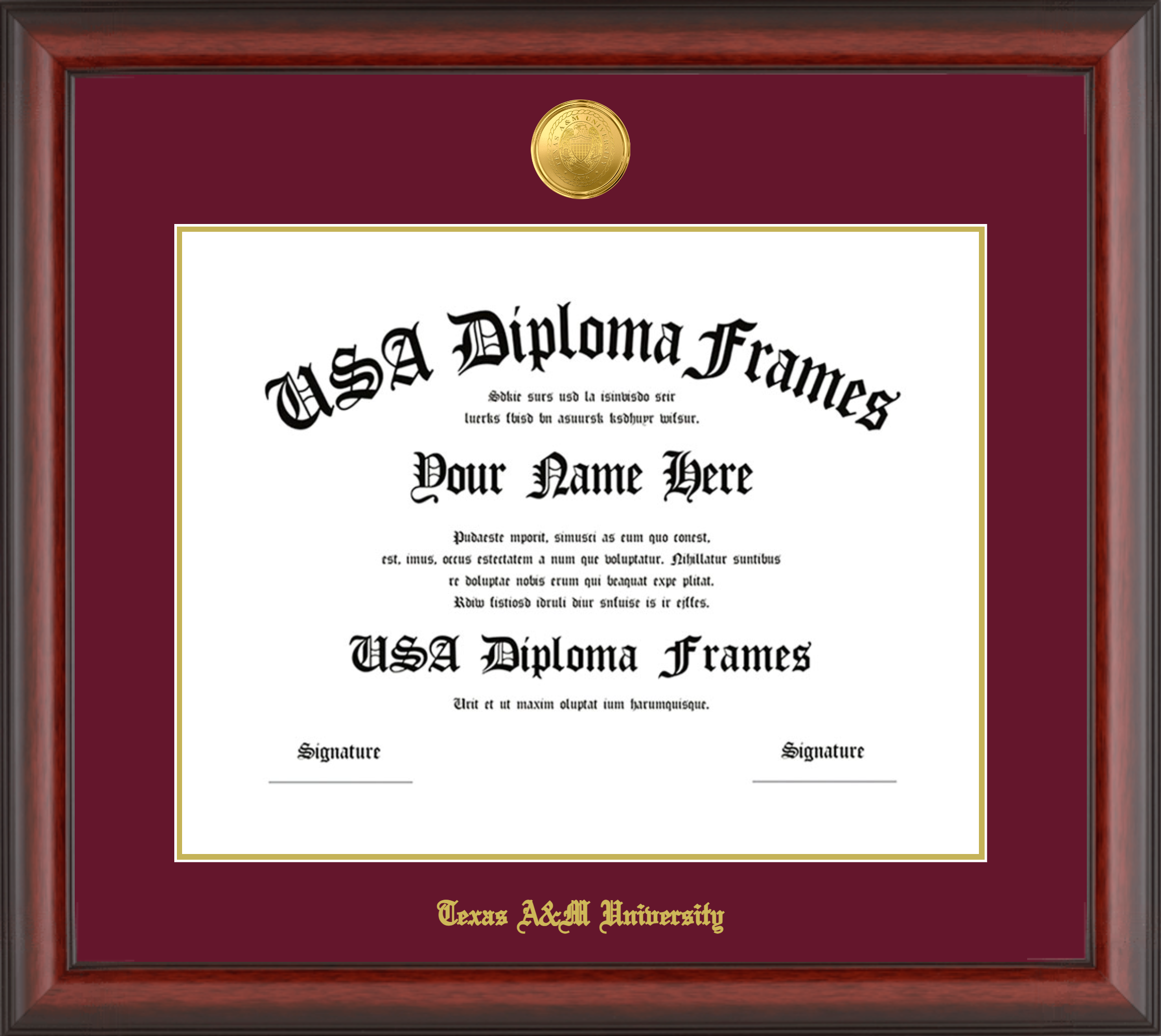Texas A&M University Diploma Frame – Cherry Mahogany Matte – Maroon and Gold Mat – Medallion