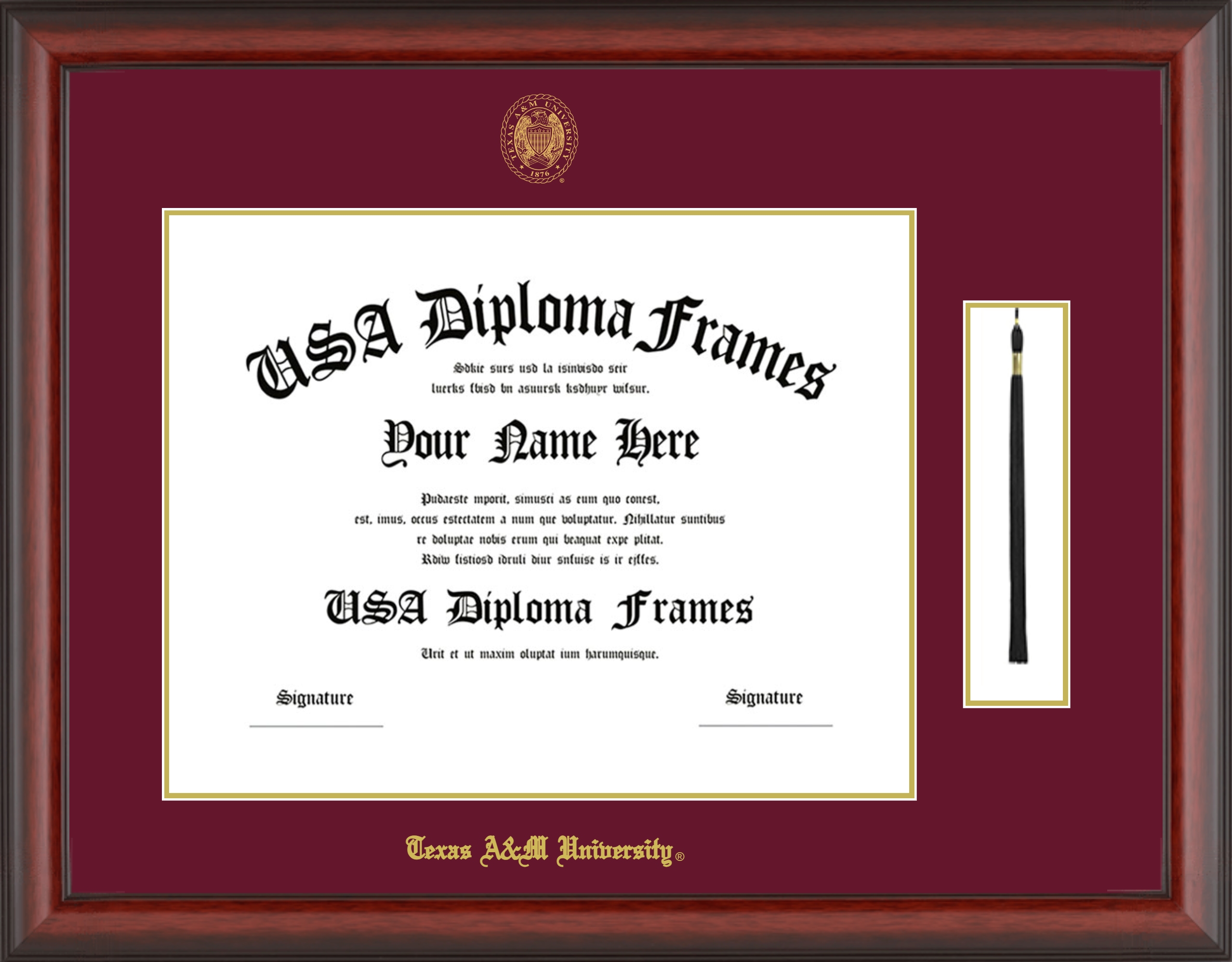 Texas A&M University – Single Horizontal Document ( 12.5 x 16 ) – Cherry Mahogany Matte – Maroon Mat – Gold Accent Mat – With Tassel(Default) – With Seal(University Seal Gold) – With Gold Embossing (Texas A&M University)