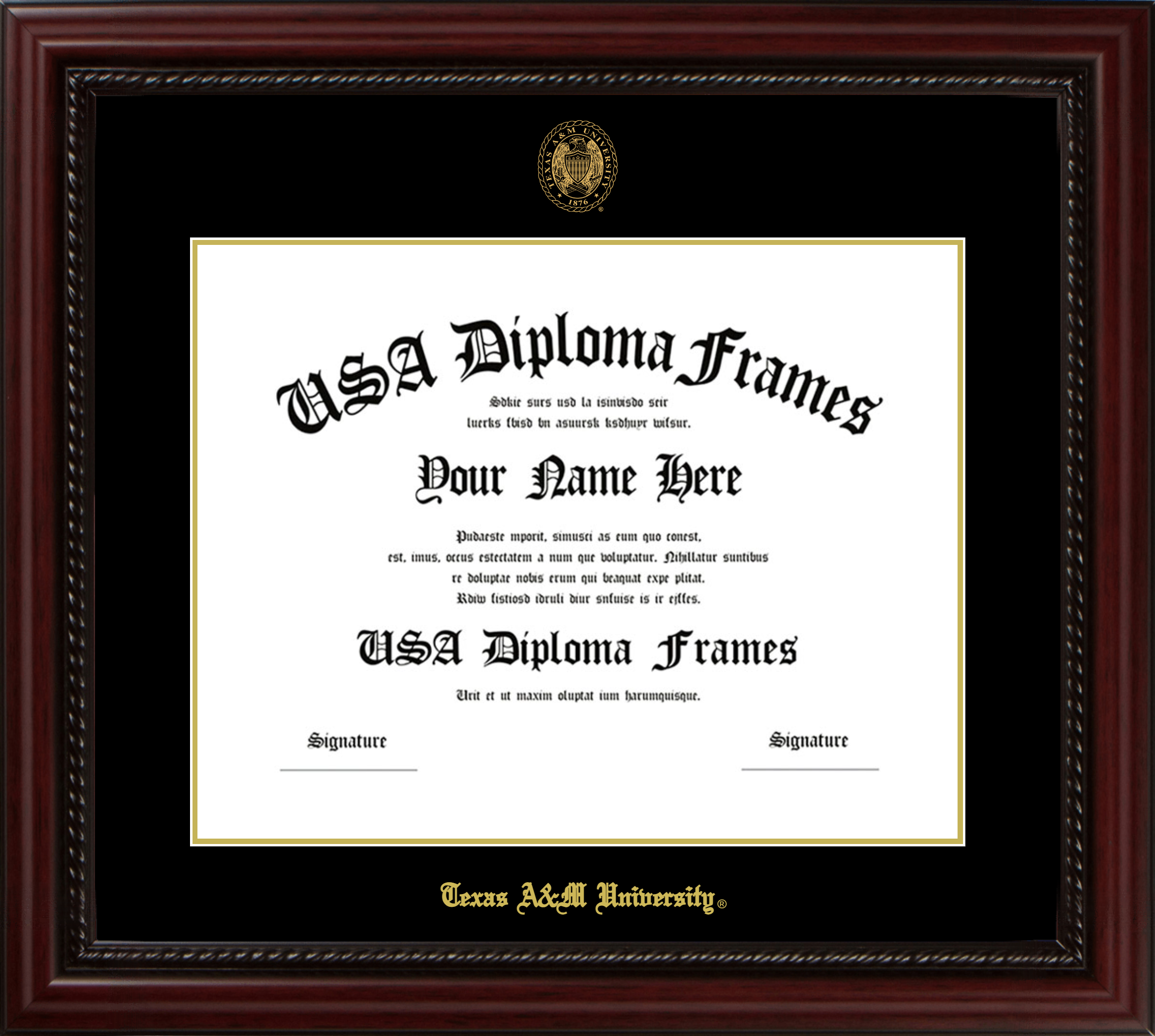 Texas A&M University – Single Horizontal Document ( 12.5 x 16 ) – Executive Cherry Rope – Black Mat – Gold Accent Mat – With Seal(University Seal Gold) – With Gold Embossing (Texas A&M University)