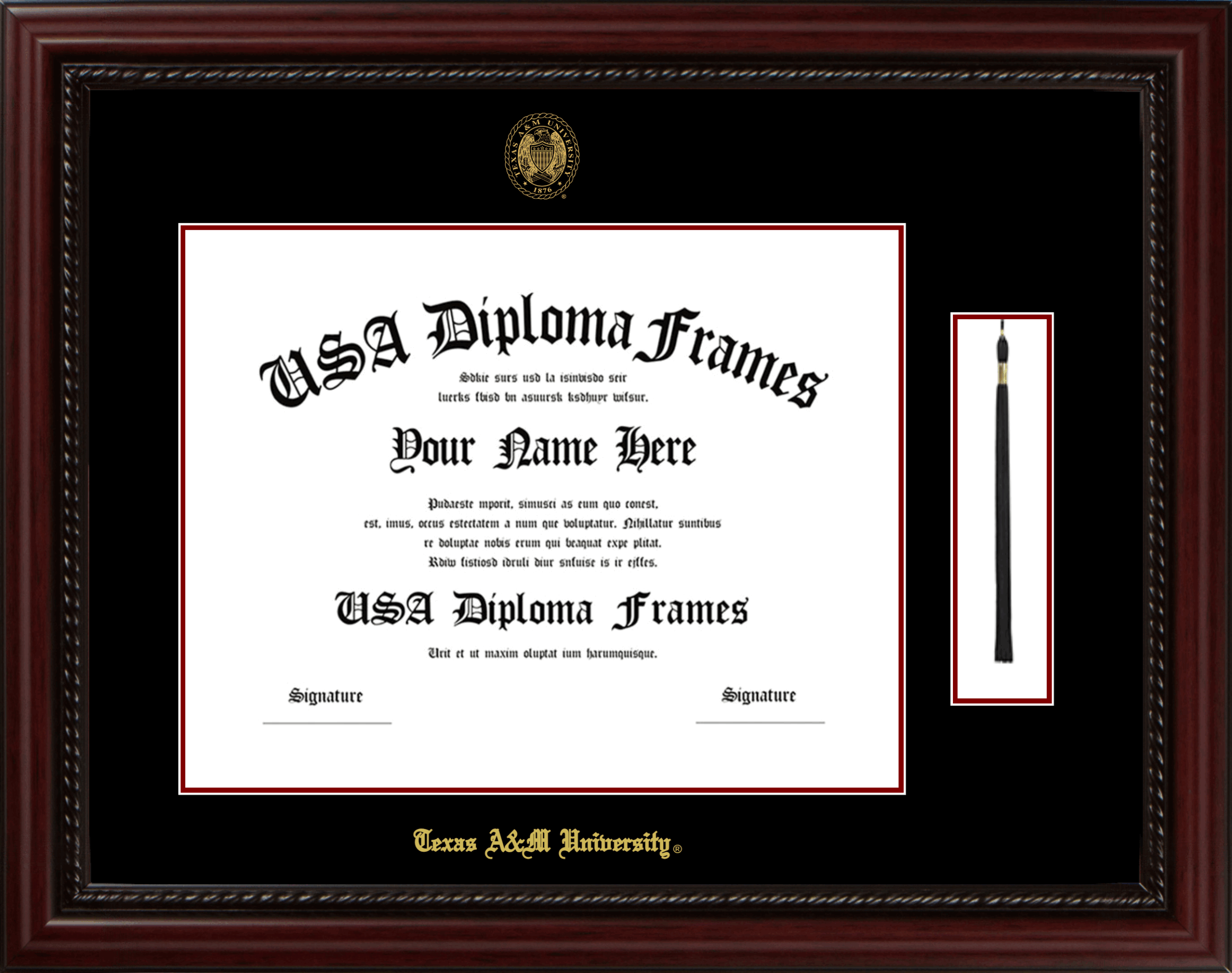 Texas A&M University – Single Horizontal Document ( 12.5 x 16 ) – Executive Cherry Rope – Black Mat – Maroon Accent Mat – With Tassel(Default) – With Seal(University Seal Gold) – With Gold Embossing (Texas A&M University)