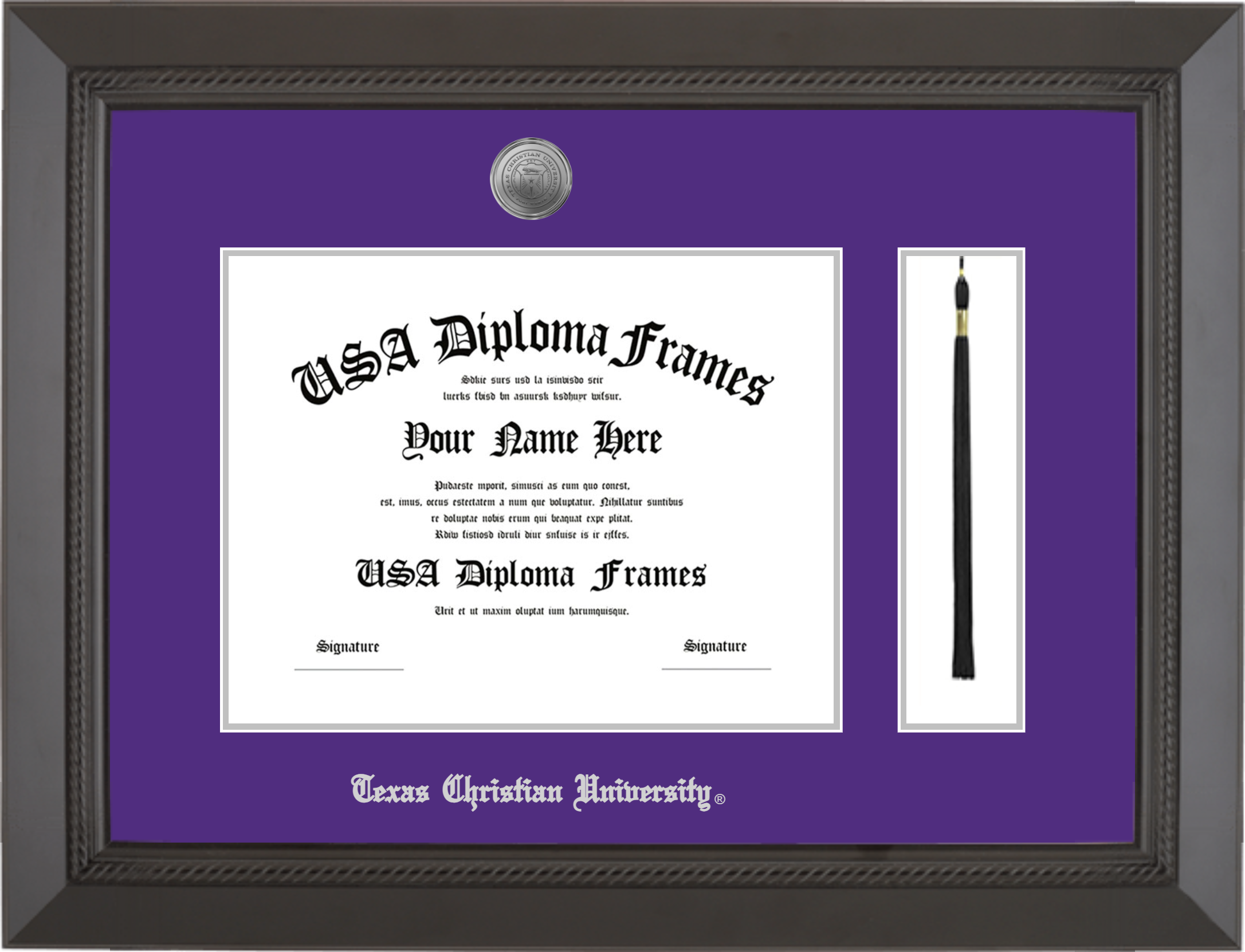 Texas Christian University Diploma Frame with Tassel – Black Rope – Purple and Silver Mat – Silver Medallion