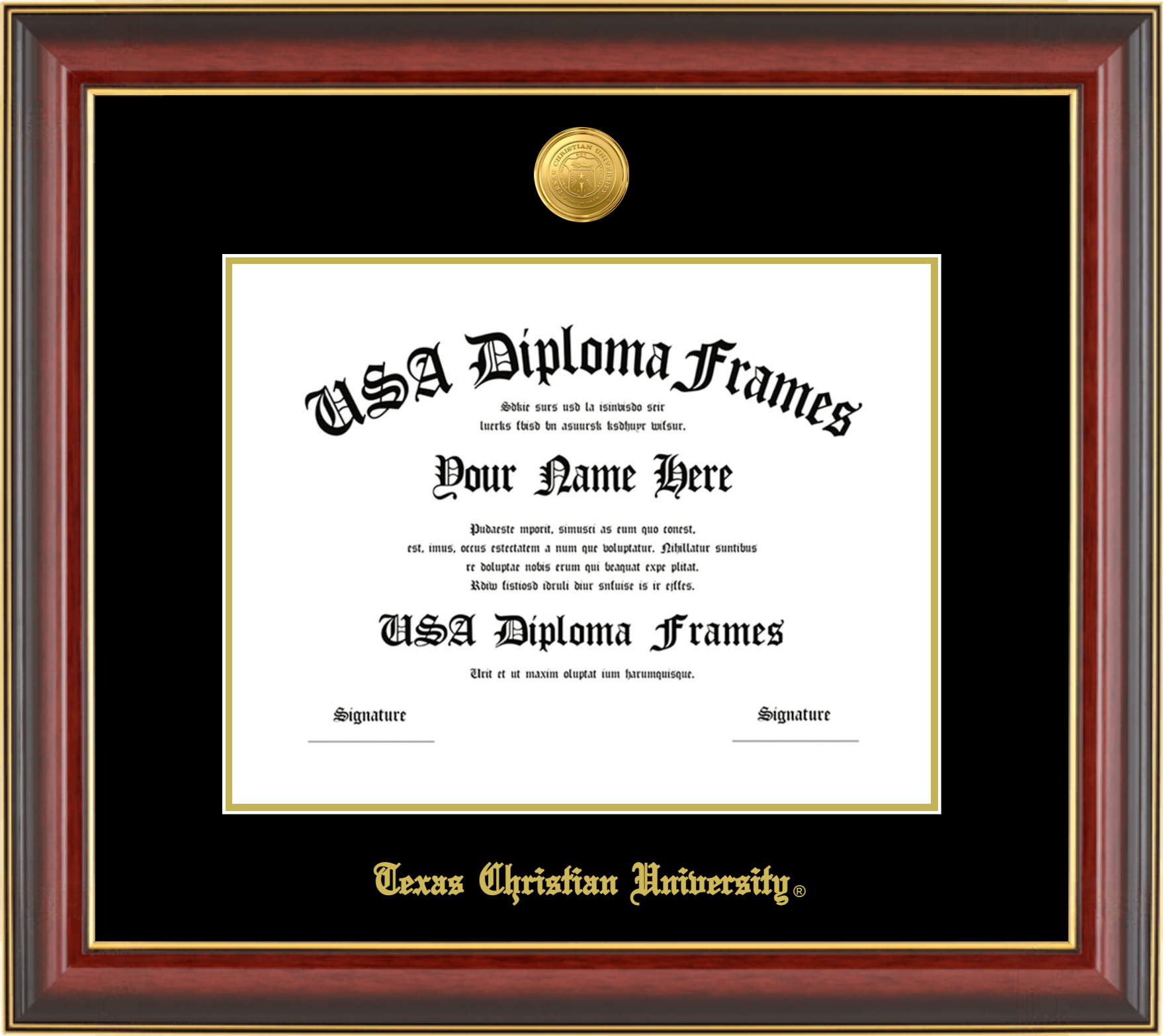 Texas Christian University Diploma Frame – TCU – Cherry Mahogany Gold Trim Glossy – Black and Gold Mat – Gold Medallion