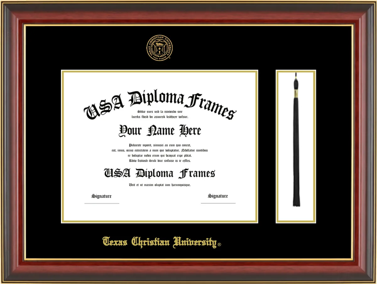 Texas Christian University – Single Horizontal Document ( Diploma ) – Cherry Mahogany Gold Trim Glossy – Black Mat – Gold Accent Mat – With Tassel(Default) – With Seal(University Seal Gold) – With Gold Embossing (Texas Christian University)