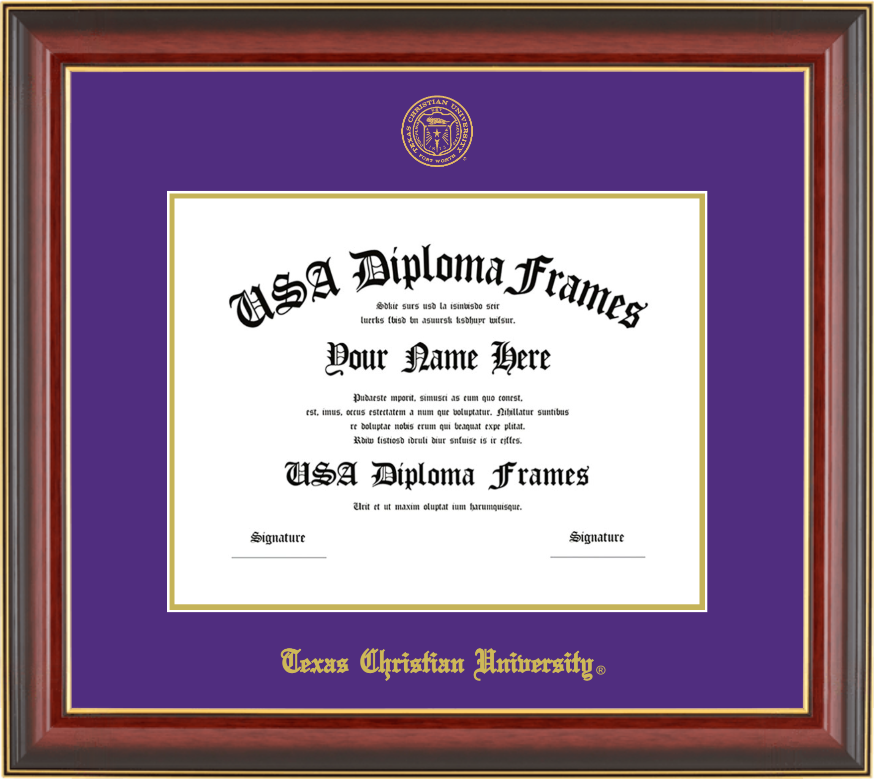 Texas Christian University – Single Horizontal Document ( Diploma ) – Cherry Mahogany Gold Trim Glossy – Purple Mat – Gold Accent Mat – With Seal(University Seal Gold) – With Gold Embossing (Texas Christian University)
