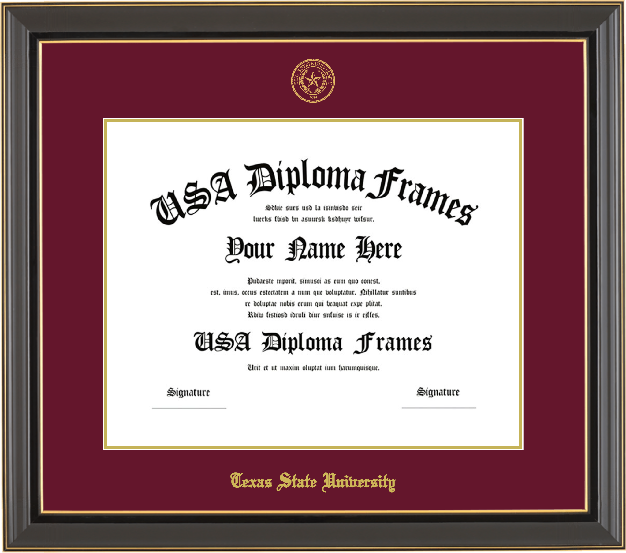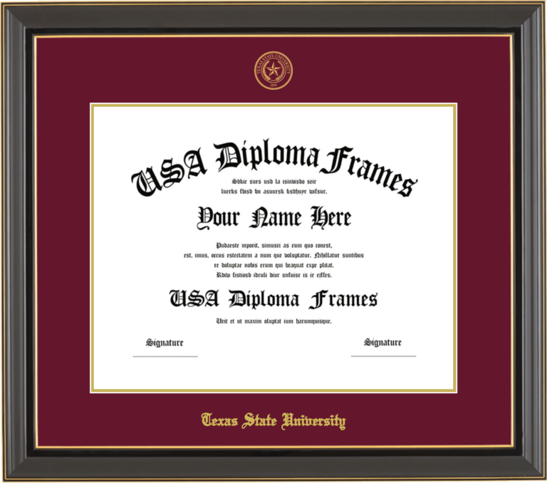 Texas State University – Single Horizontal Document ( Diploma ) – Black Gold Trim Glossy – Maroon Mat – Gold Accent Mat – With Seal(University Seal Gold) – With Gold Embossing (Texas State University)