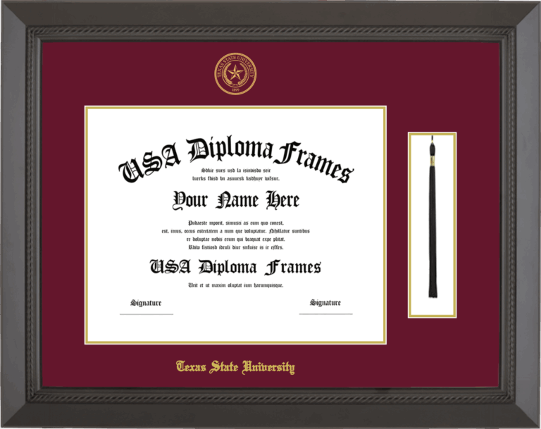 Texas State University Diploma Frame with Tassel – Black Rope – Maroon and Gold Mat