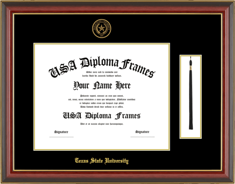 Texas State University Diploma Frame with Tassel – Cherry Mahogany Gold Trim Glossy – Black and Gold Mat
