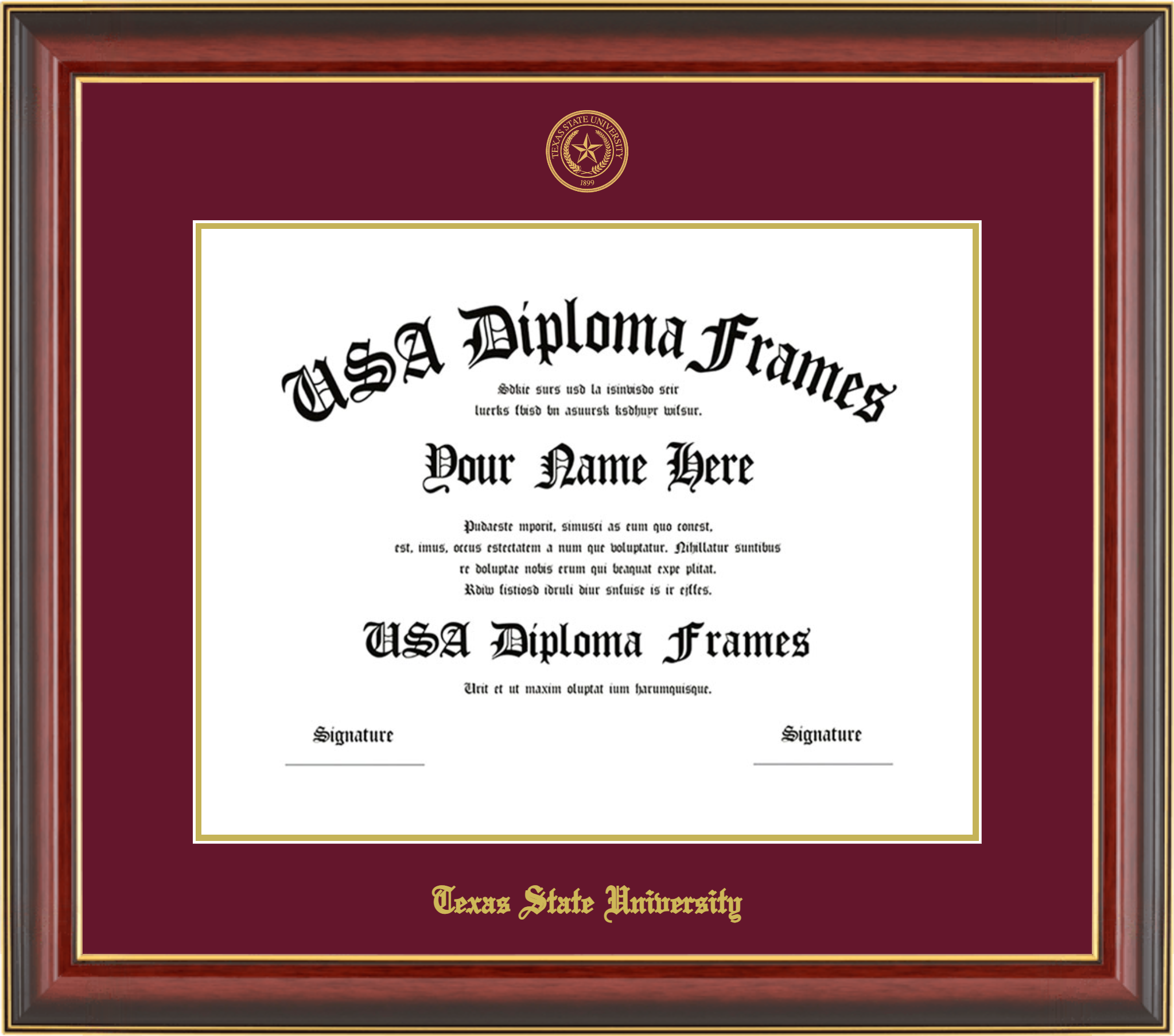 Texas State University – Single Horizontal Document ( Diploma ) – Cherry Mahogany Gold Trim Glossy – Maroon Mat – Gold Accent Mat – With Seal(University Seal Gold) – With Gold Embossing (Texas State University)
