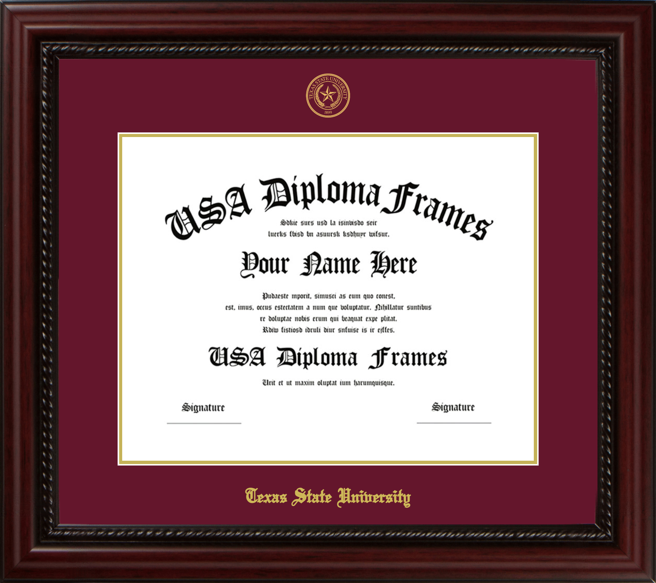 Texas State University – Single Horizontal Document ( Diploma ) – Executive Cherry Rope – Maroon Mat – Gold Accent Mat – With Seal(University Seal Gold) – With Gold Embossing (Texas State University)
