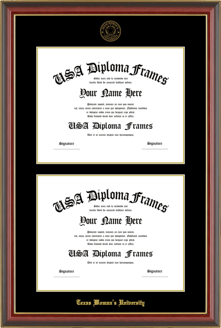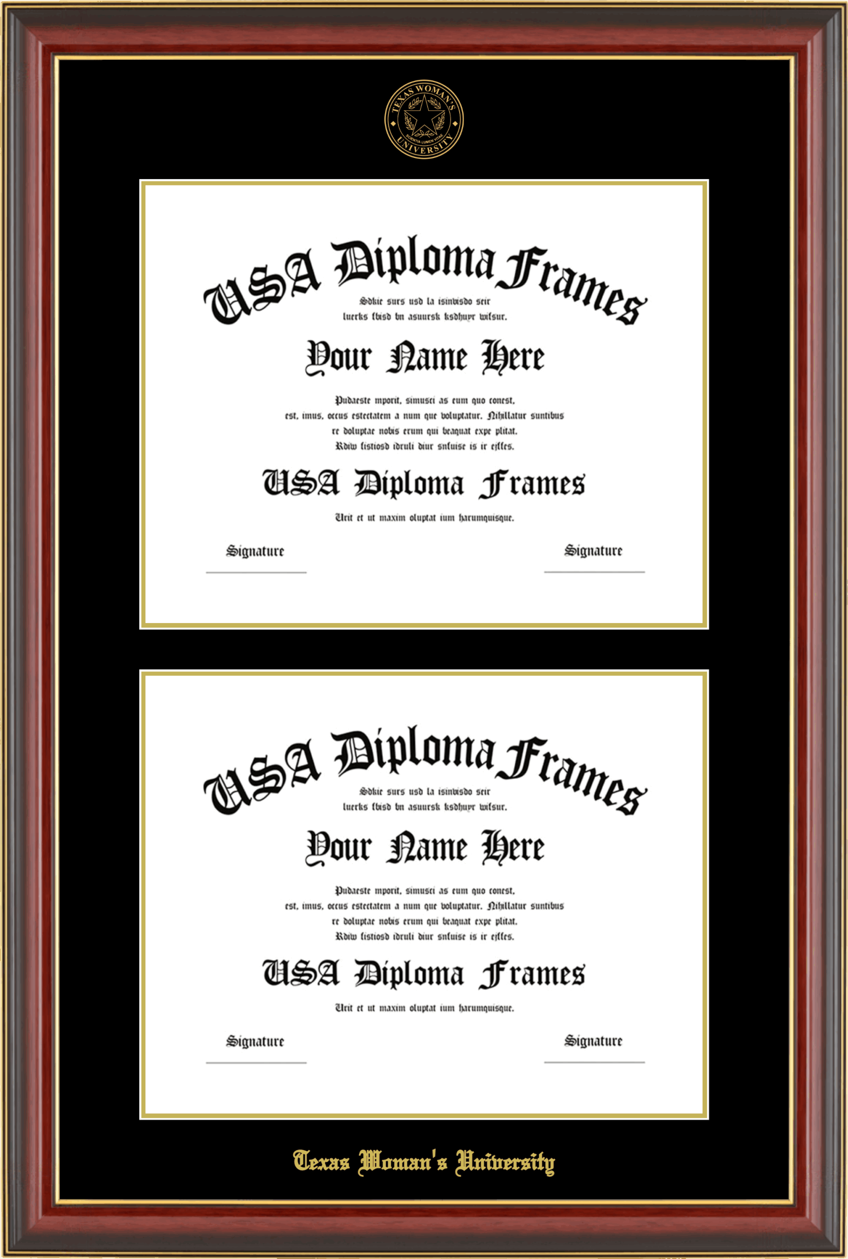 Texas Woman’s University Double Diploma Frame – Double Document – Cherry Mahogany Gold Trim Glossy – Black and Gold Mat