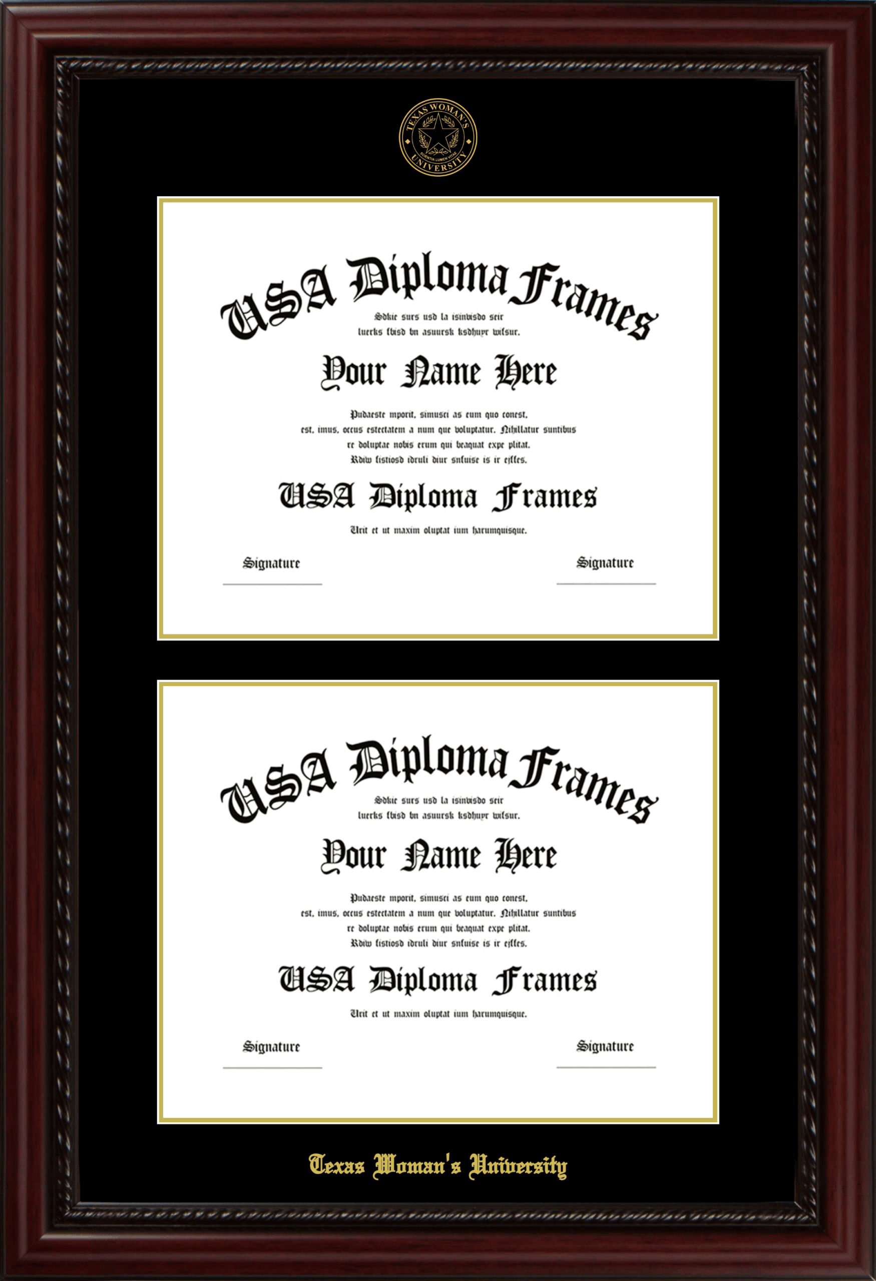 Want to explore more styles? Browse our full range of diploma frame layouts, or visit the Texas Woman's University to view options available for your school. Looking for a fully personalized design? Try our custom Frame Builder and create a frame that’s uniquely yours.