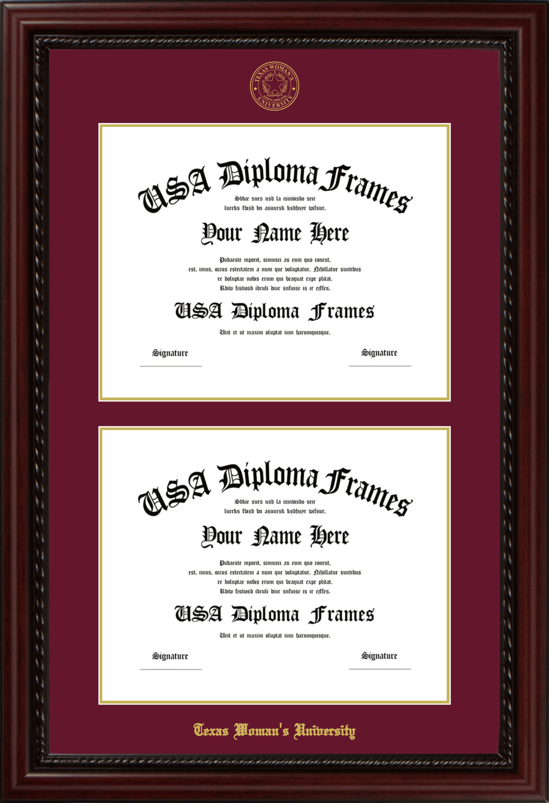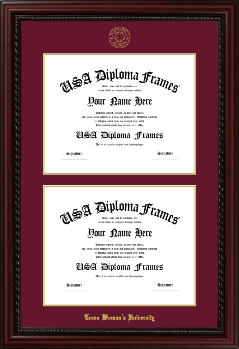 Texas Woman’s University Double Diploma Frame – Double Document – Executive Cherry Rope – Maroon and Gold Mat
