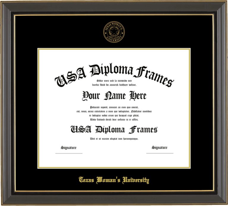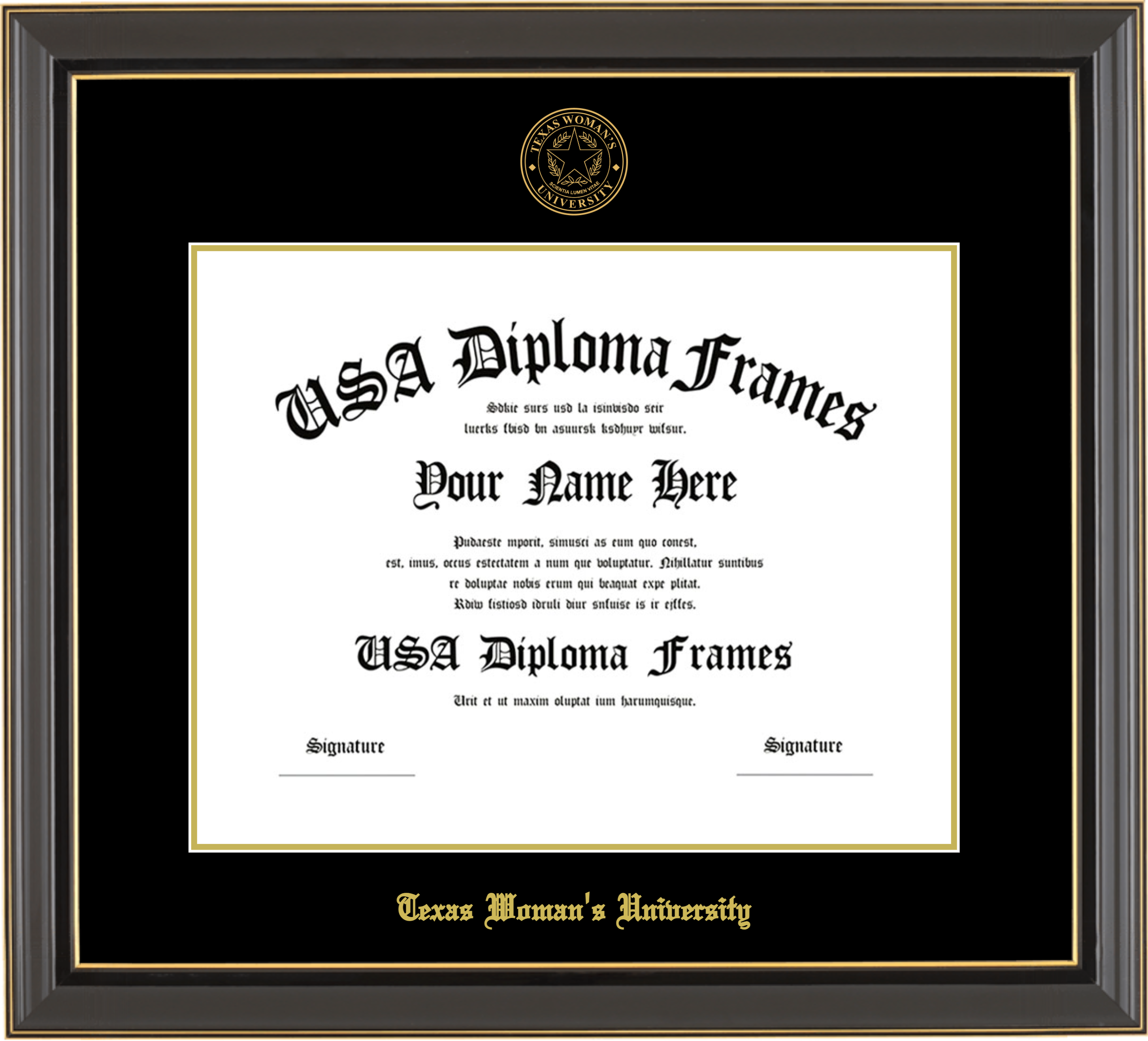 Texas Woman’s University Diploma Frame – Black Gold Trim Glossy – Black and Gold Mat