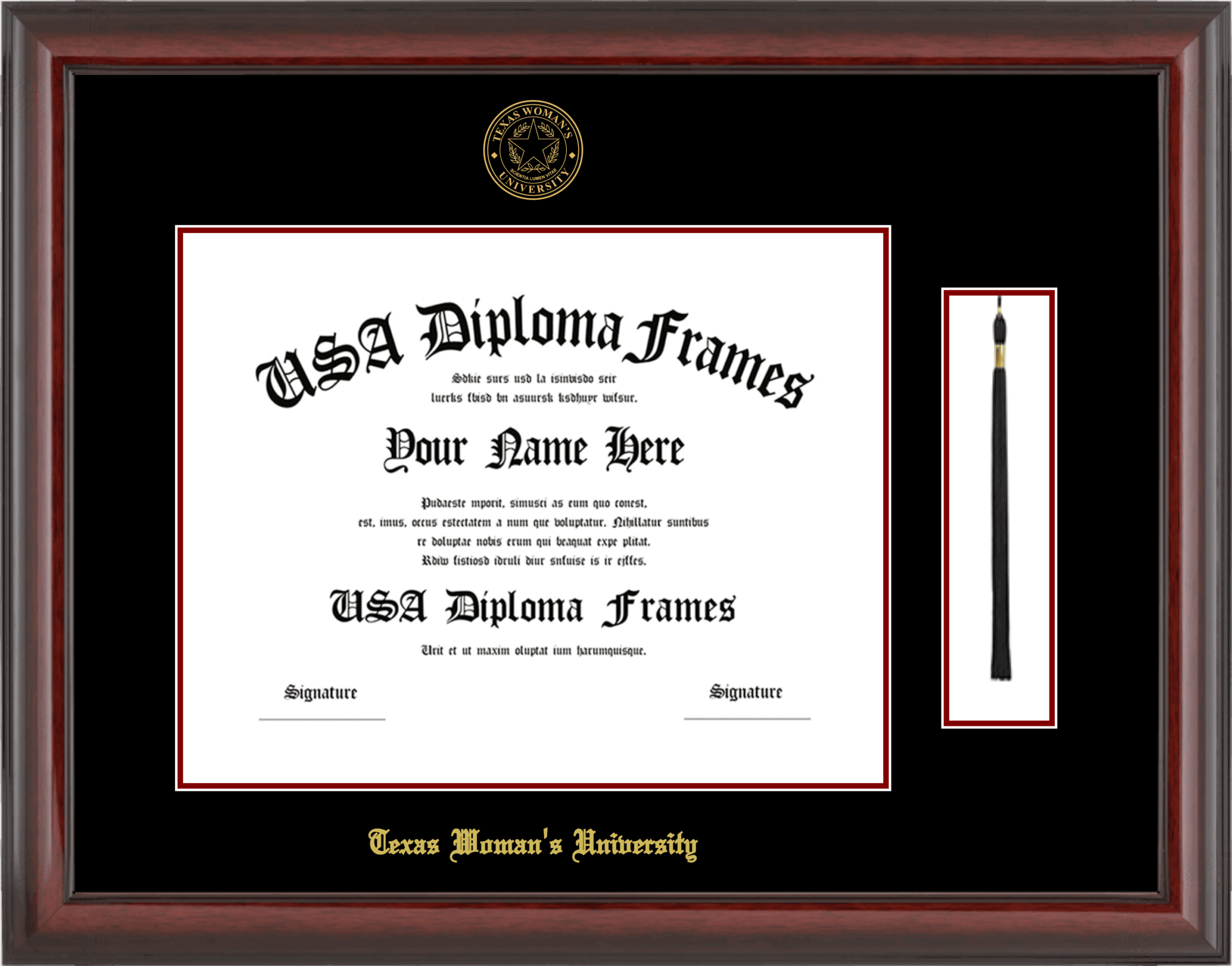 Texas Woman’s University Diploma Frame with Tassel – Cherry Mahogany Glossy – Black and Maroon Mat