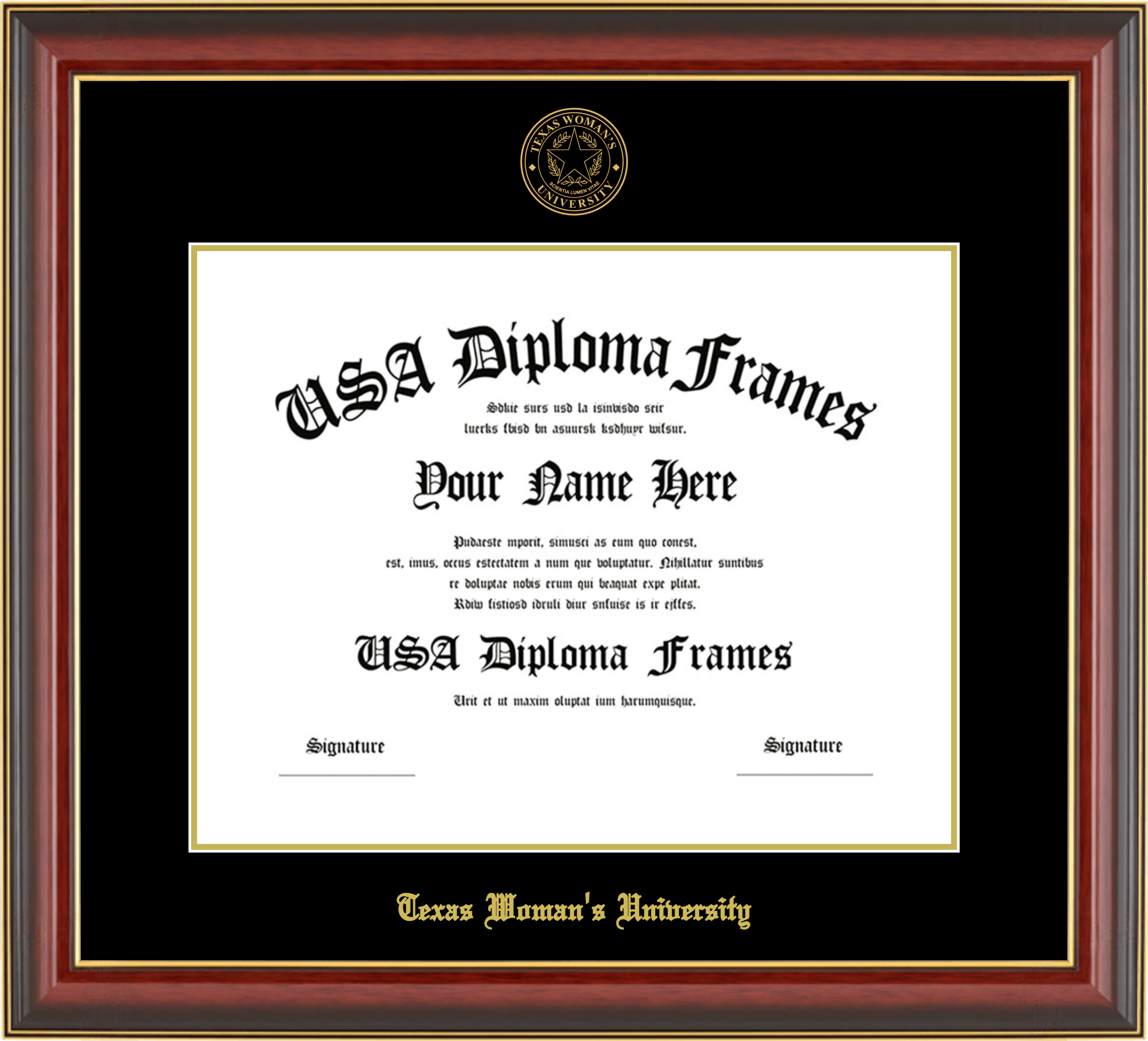 Texas Woman’s University Diploma Frame – Cherry Mahogany Gold Trim Glossy – Black and Gold Mat