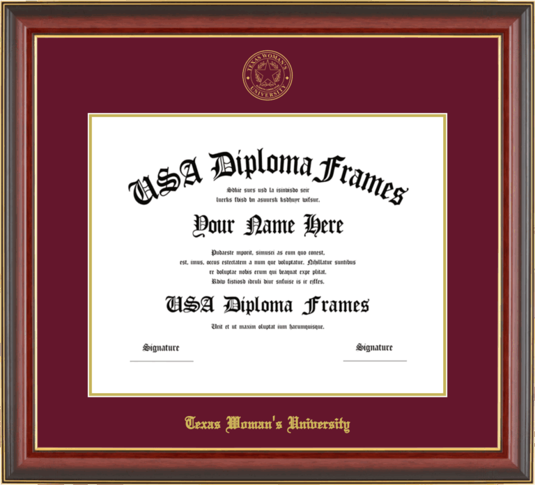 Texas Woman’s University Diploma Frame – Cherry Mahogany Gold Trim Glossy – Maroon and Gold Mat