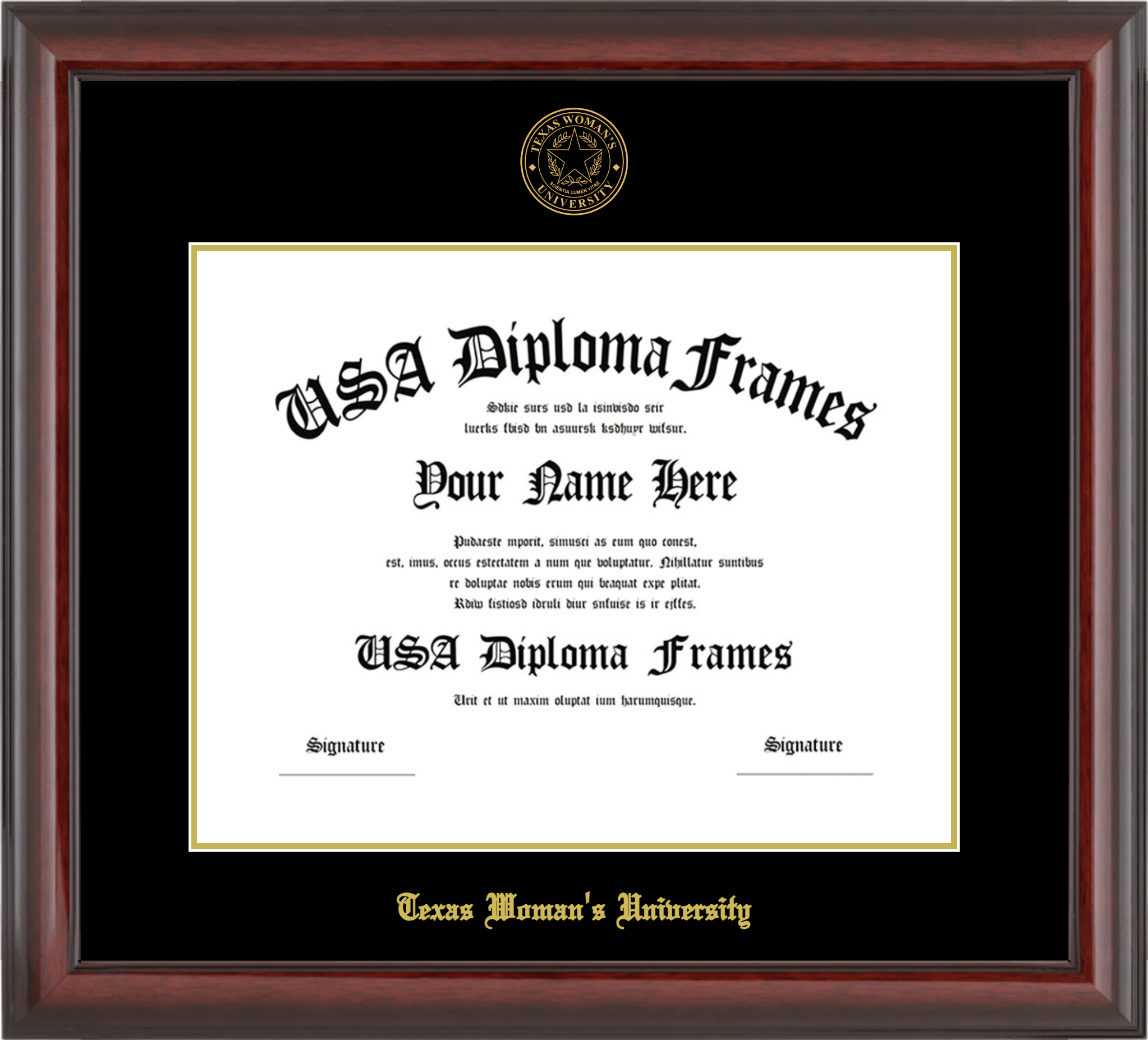 Want to explore more styles? Browse our full range of diploma frame layouts, or visit the Texas Woman's University to view options available for your school. Looking for a fully personalized design? Try our custom Frame Builder and create a frame that’s uniquely yours.
