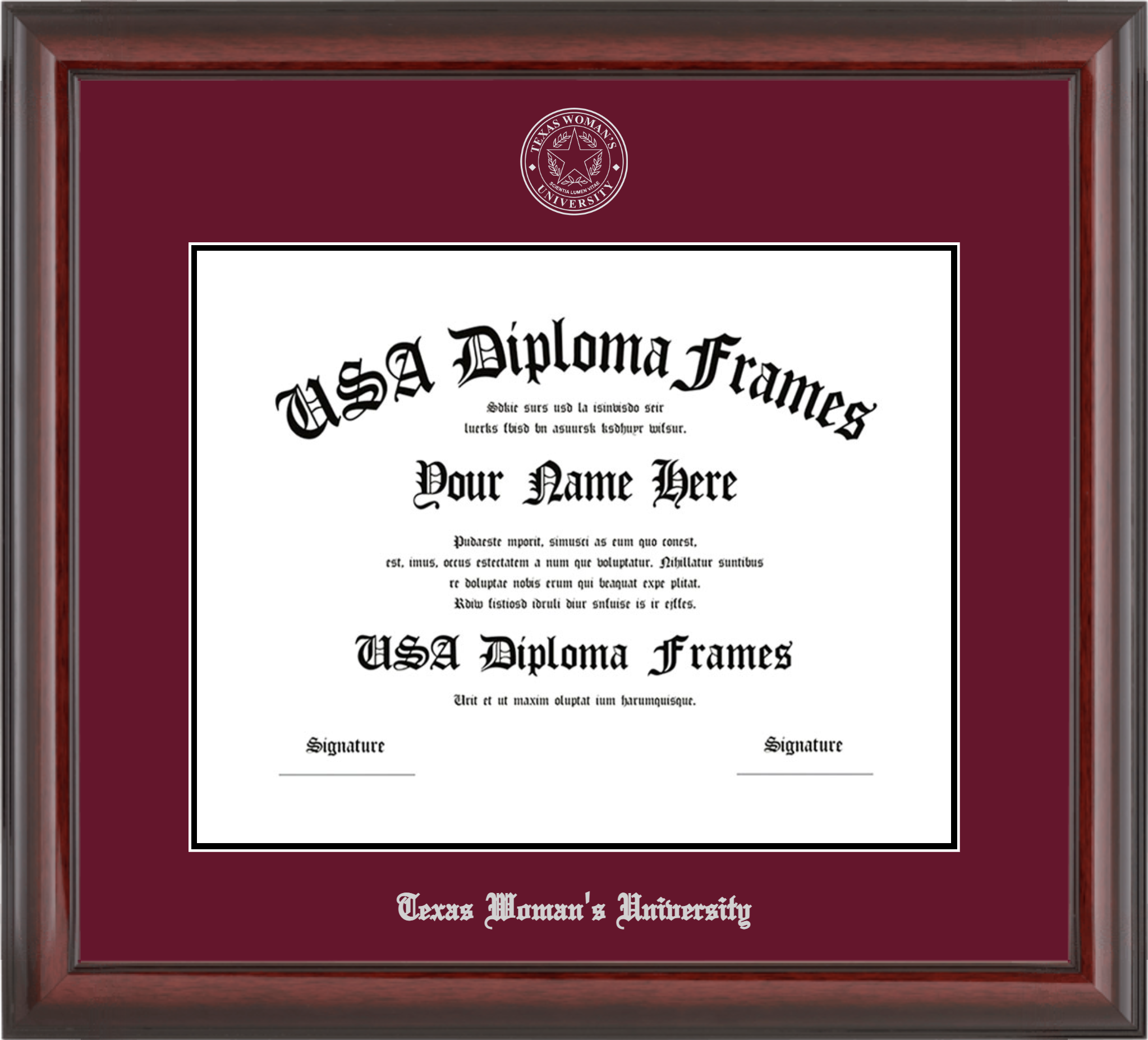 Texas Woman’s University – Single Horizontal Document ( Diploma ) – Cherry Mahogany Glossy – Maroon Mat – Black Accent Mat – With Seal(University Seal Silver) – With Silver Embossing (Texas Woman’s University)