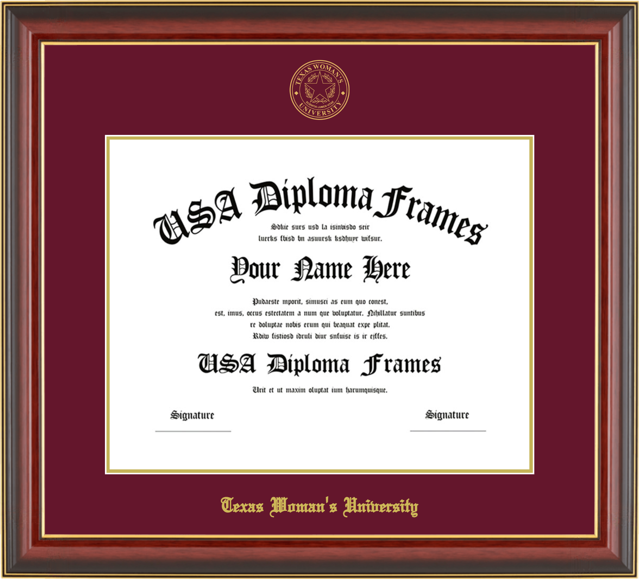 Texas Woman’s University – Single Horizontal Document ( Diploma ) – Cherry Mahogany Gold Trim Glossy – Maroon Mat – Gold Accent Mat – With Seal(University Seal Gold) – With Gold Embossing (Texas Woman’s University)